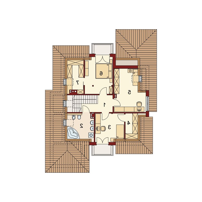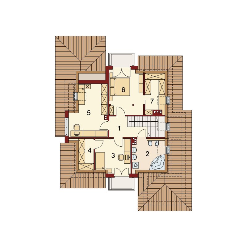 Duża ilość okien zaprasza do wnętrza pełnego światła. Dzięki przeszkleniom słońce dociera tutaj o każdej porze dnia. Wiatrołap łączy strefę dzienną parteru z częścią gospodarczą domu, na którą składa się garaż oraz kotłownia. Poddasze, z trzema sypialniami oraz przestronną łazienką, stanowi strefę nocną domku. Niewątpliwym atutem będą dwie prywatne garderoby dostępne bezpośrednio z pokoi.