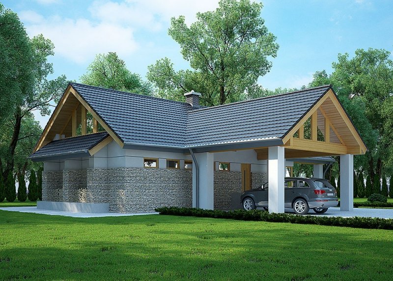- Elewacje: wykończone tynkiem silikonowym, kamieniem naturalnym ciętym