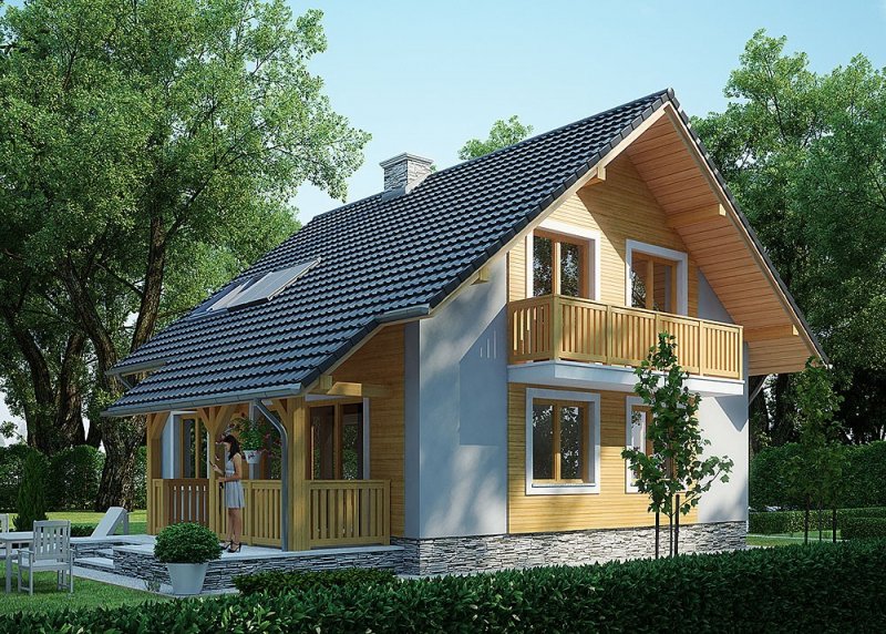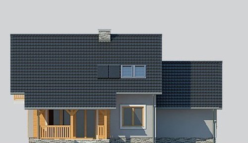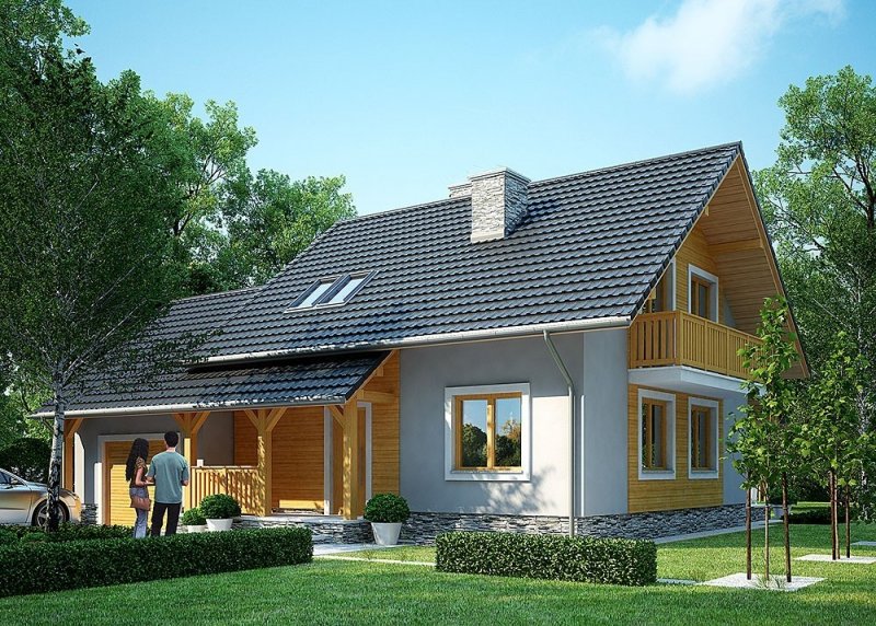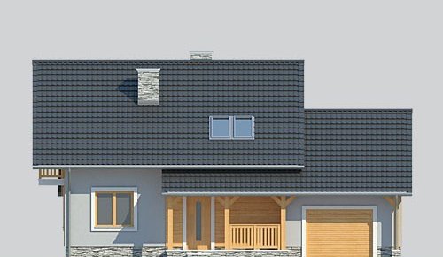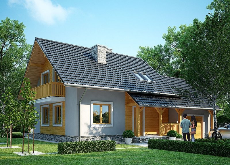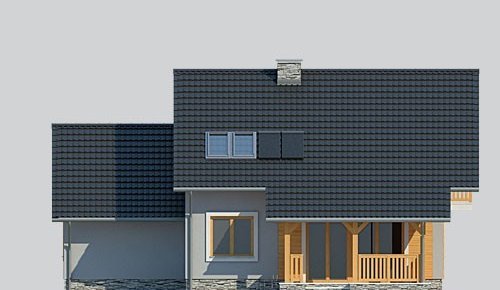 - Elewacje: wykończone tynkiem silikonowym, okładzina z szarego łupka, okładzina z drewna impregnowanego.
