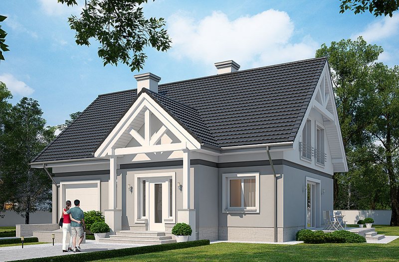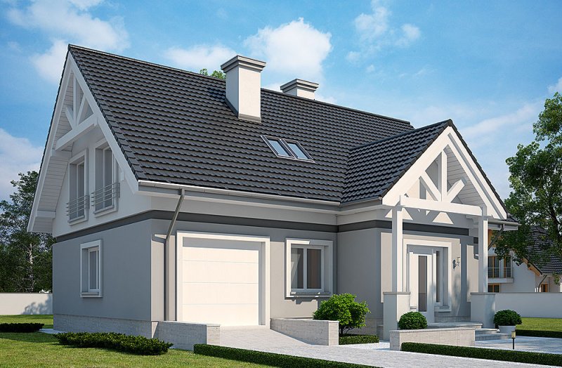Dom parterowy z użytkowym poddaszem, niepodpiwniczony z jednostaniskowym garażem.