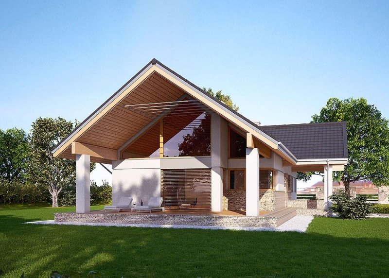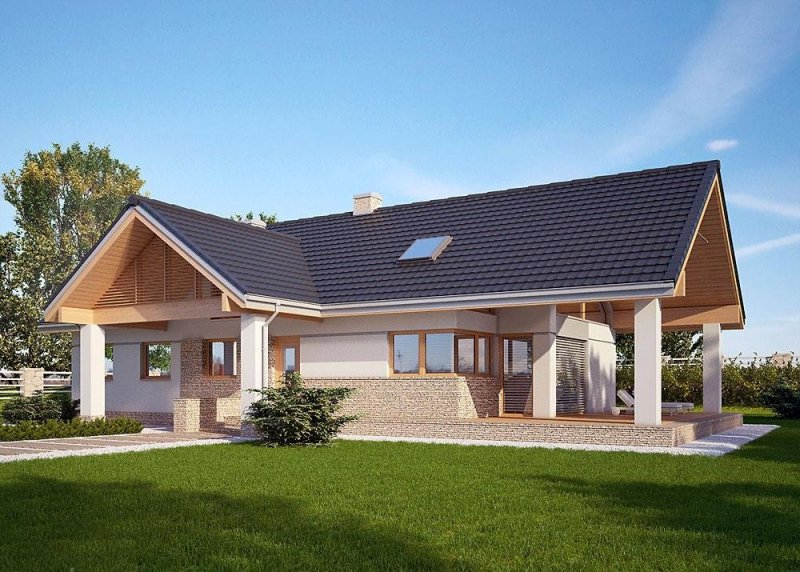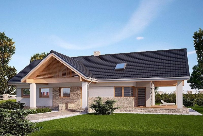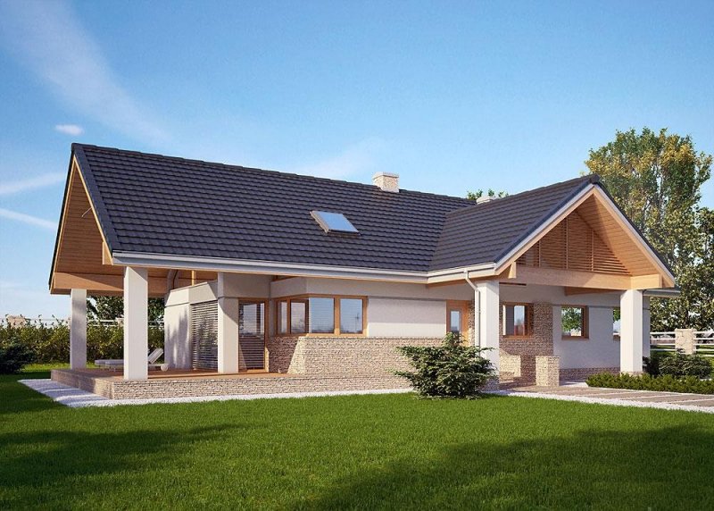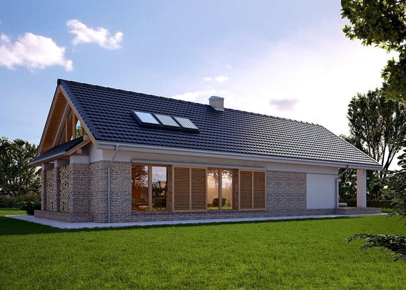 - Elewacje: wykończone tynkiem silikonowym, kamieniem naturalnym łupanym