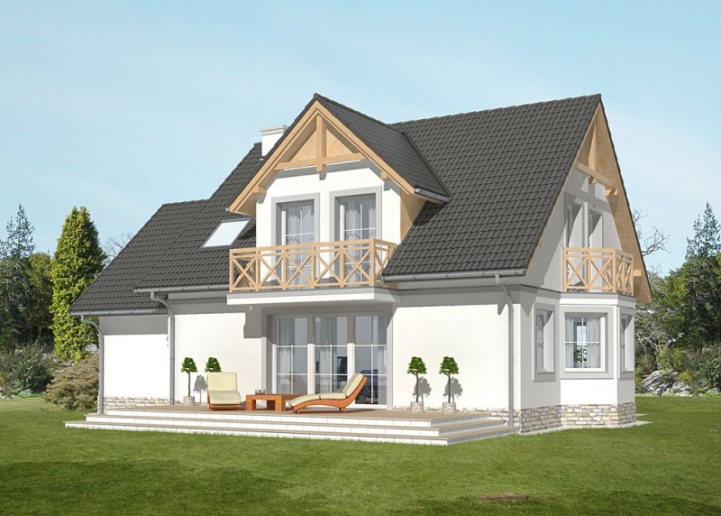 - Elewacje: wykończone tynkiem silikonowym, częściowo obłożone kamieniem naturalnym