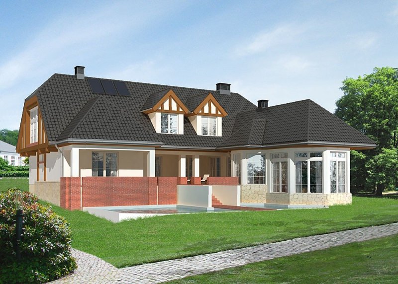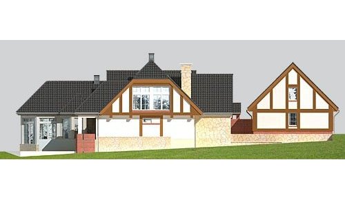 - Elewacje: wykończone tynkiem silikonowym, oraz częściowo płytkami klinkierowymi lub kamieniem naturalnym, cokół obłożony okładziną kamienną