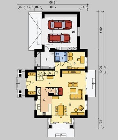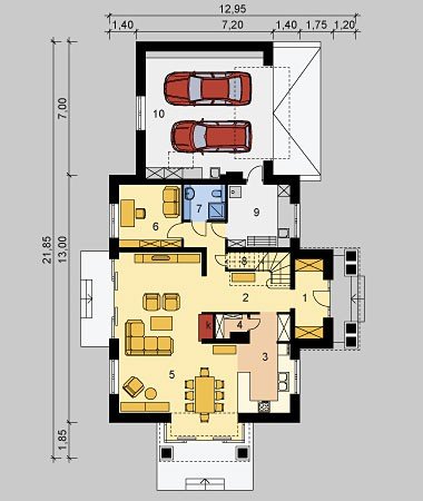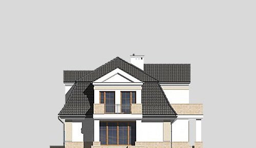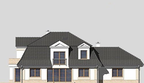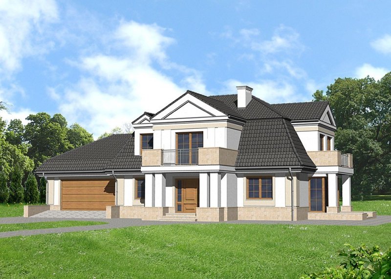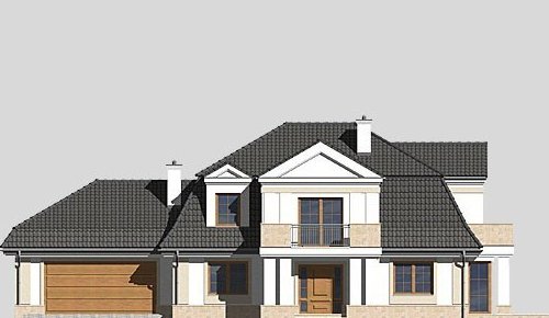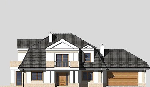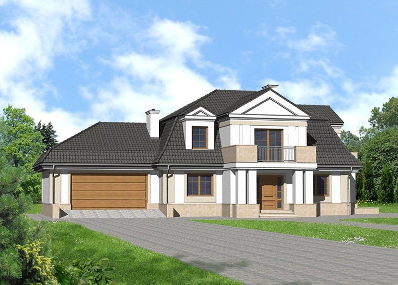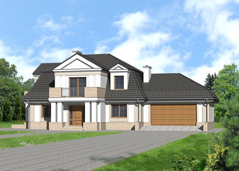 Dom jednorodzinny, parterowy z poddaszem użytkowym i dwustanowiskowym garażem.