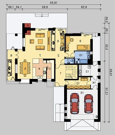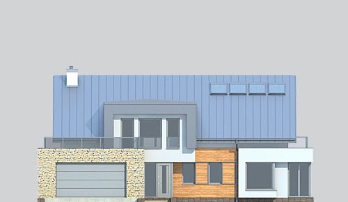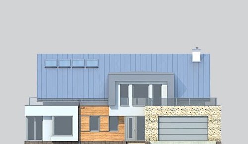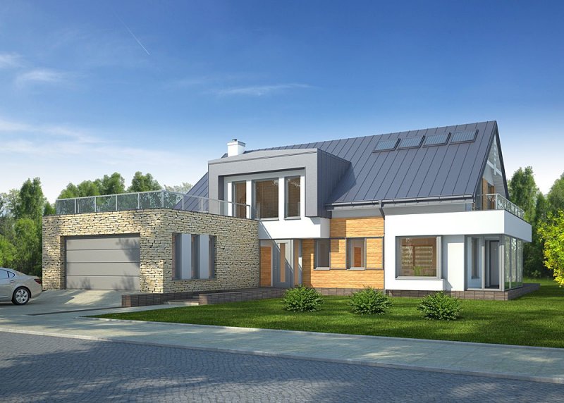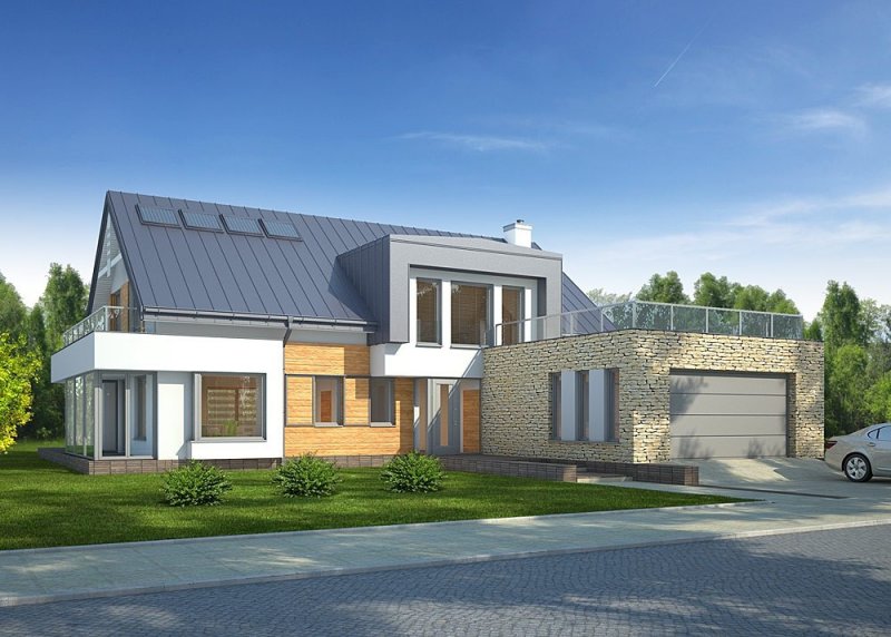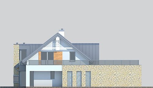 Dom parterowy z użytkowym poddaszem i dwustaniskowym garażem.
