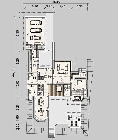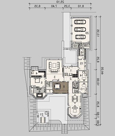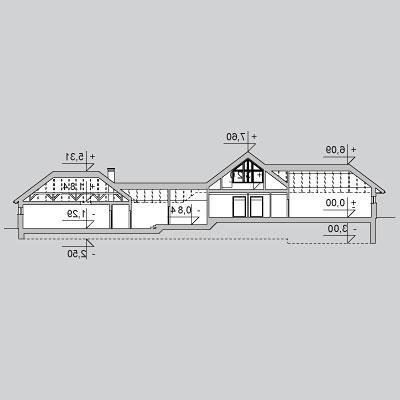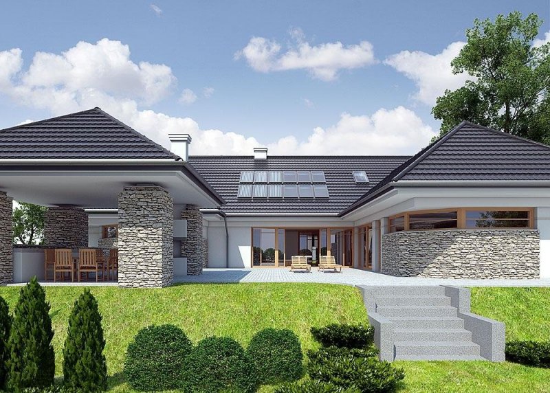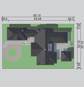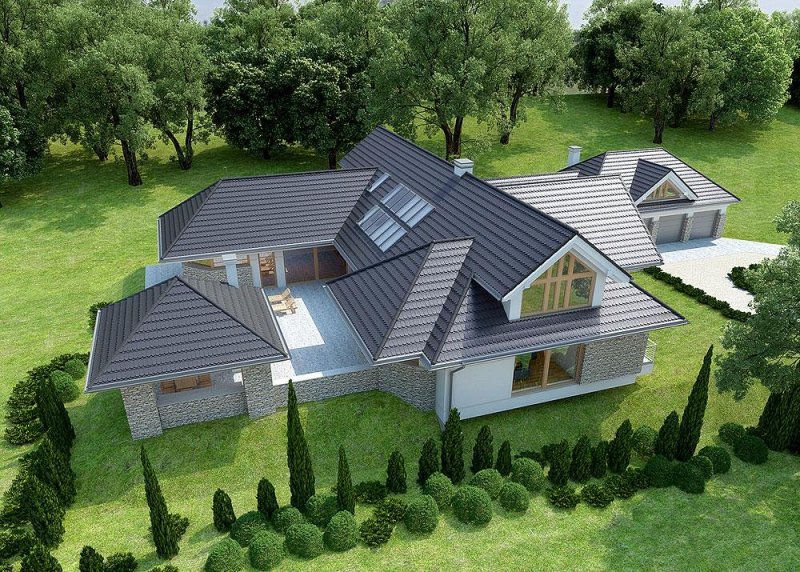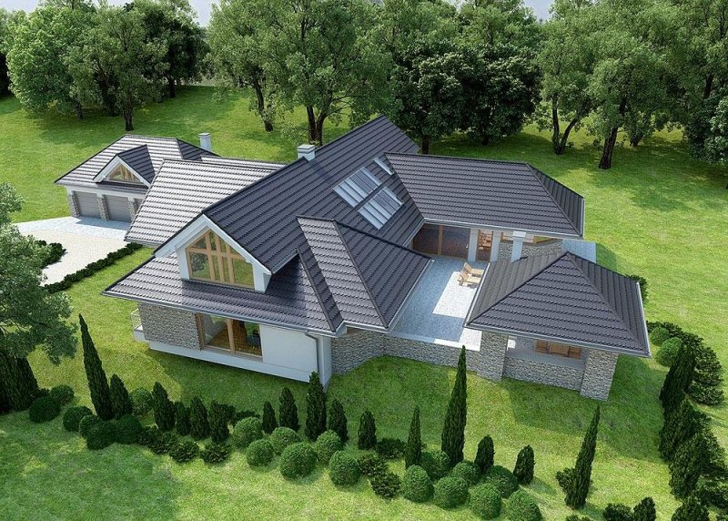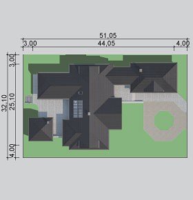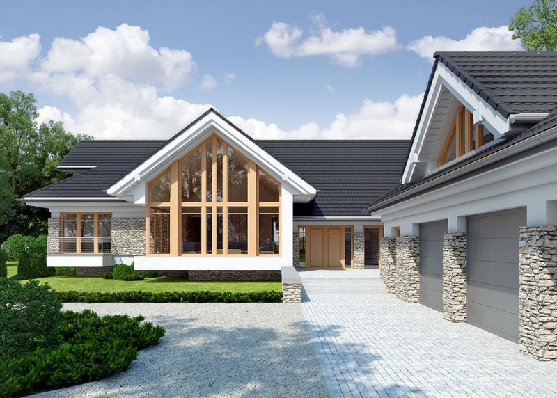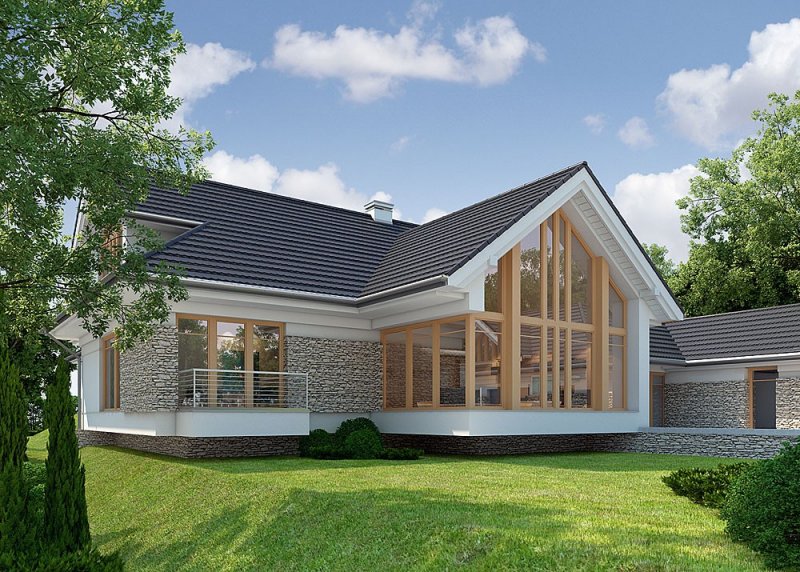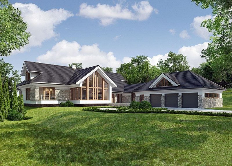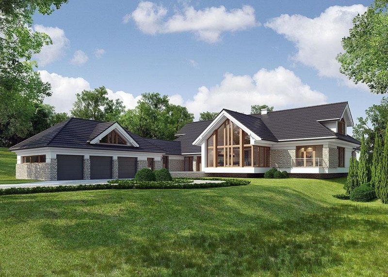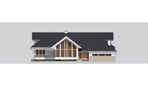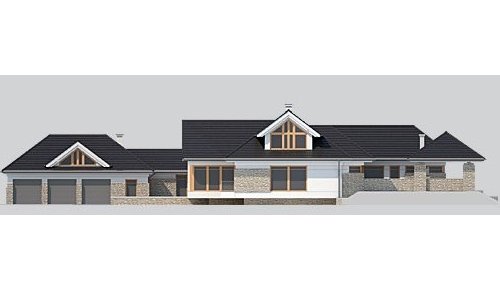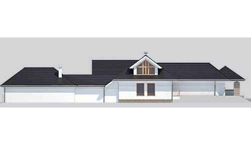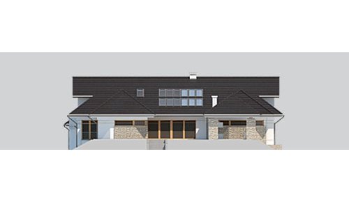 Dom z poddaszem o powierzchni użytkowej 388.58 m². Projekt posiada garaż na trzy miejsca parkingowe oraz altanę.