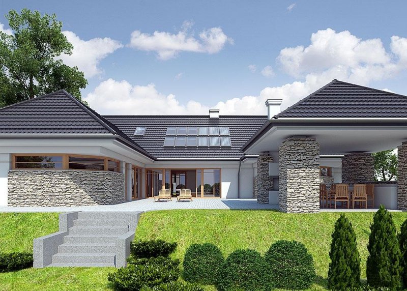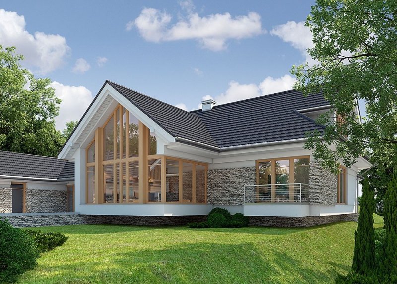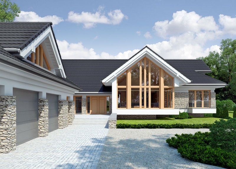 - Elewacje: wykończone tynkiem silikonowym, okładzina kamienna