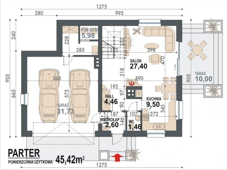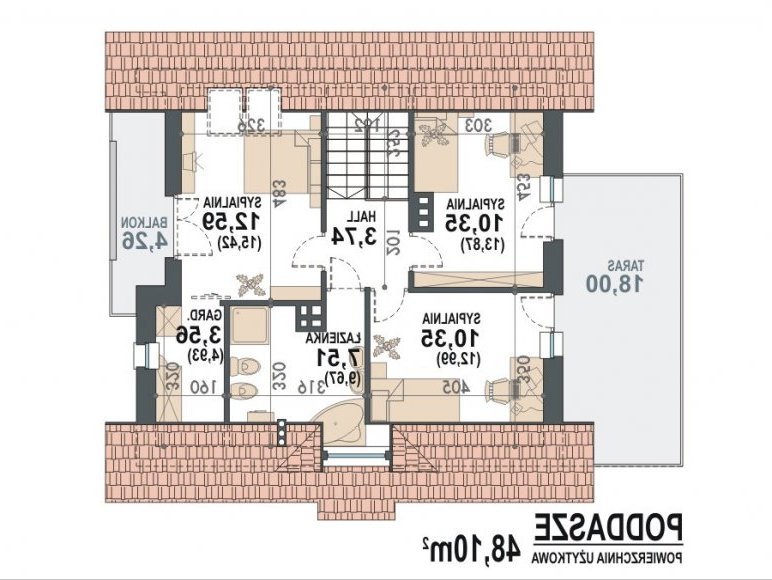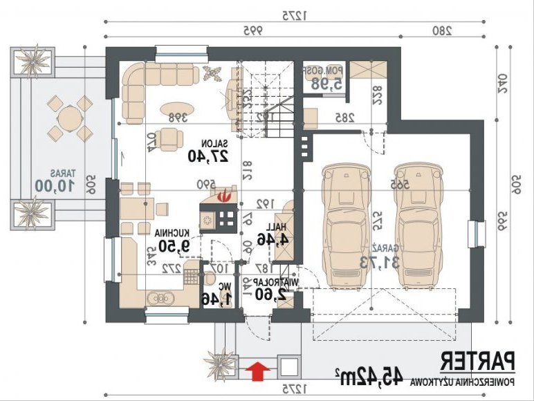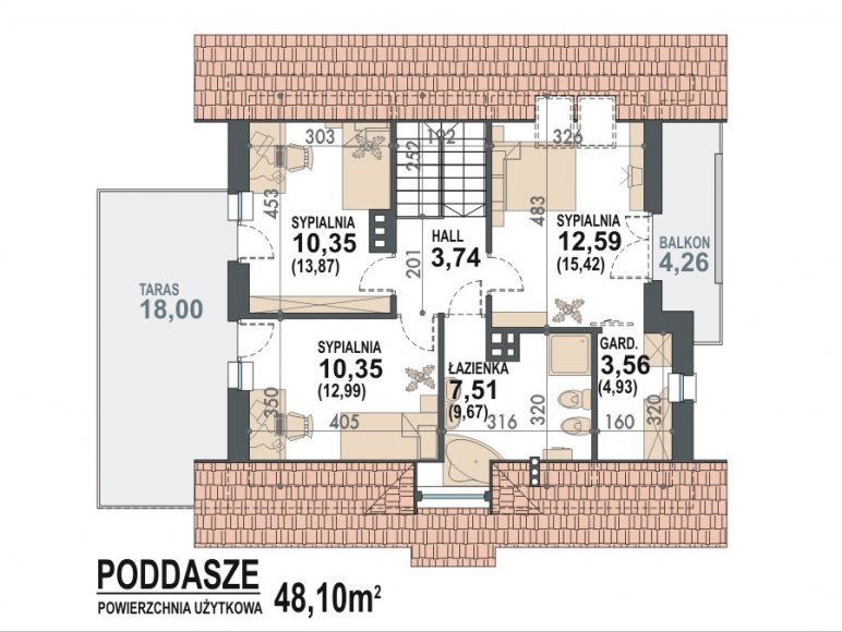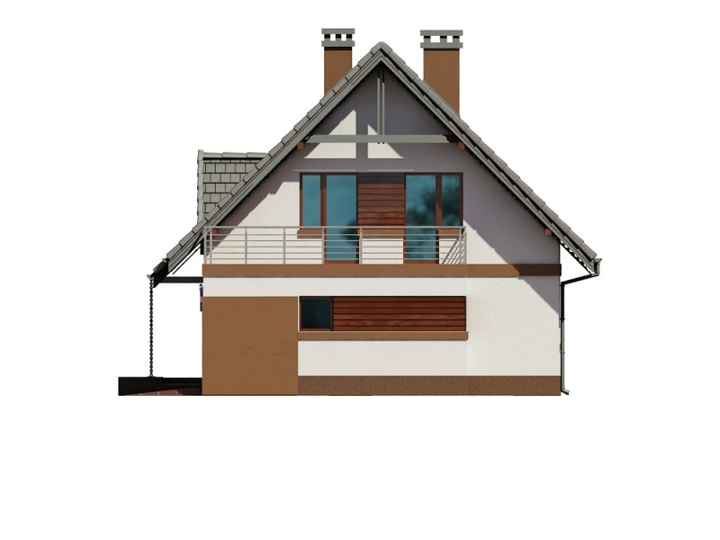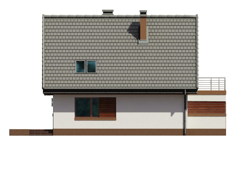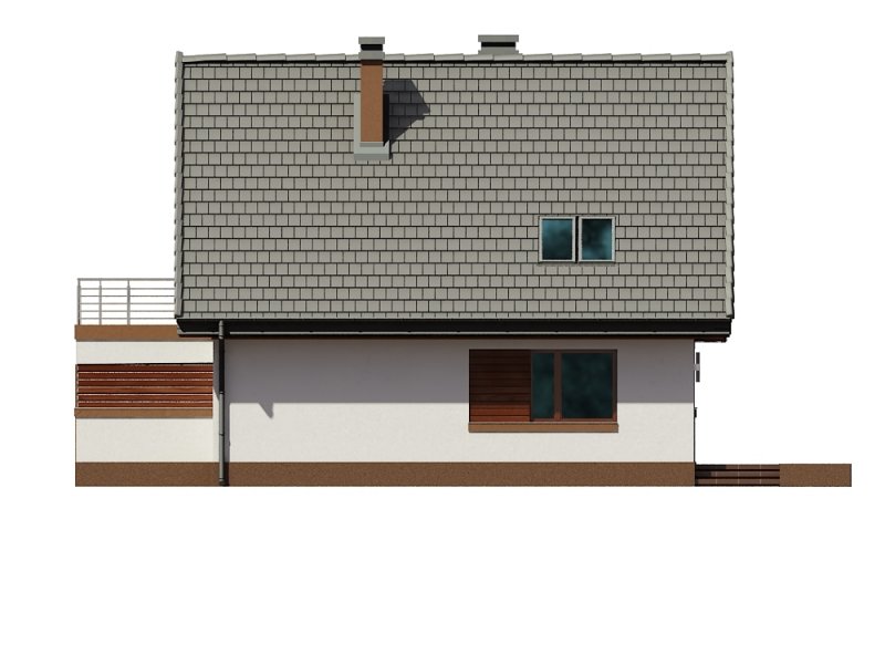 Na poddaszu dodatkową atrakcją stał się taras nad garażem, dostępny z obu sypialni przeznaczonych dla dzieci. Dom zapewnia komfortowe warunki dla czteroosobowej rodziny, zaskakuje ergonomią wnętrza. Strefa dzienna ulokowana jest w całości na parterze, zaś sypialna na piętrze. Pokój rodziców nie sąsiaduje bezpośrednio z pokojami dzieci, co ma niebagatelne znaczenie na codzień.
