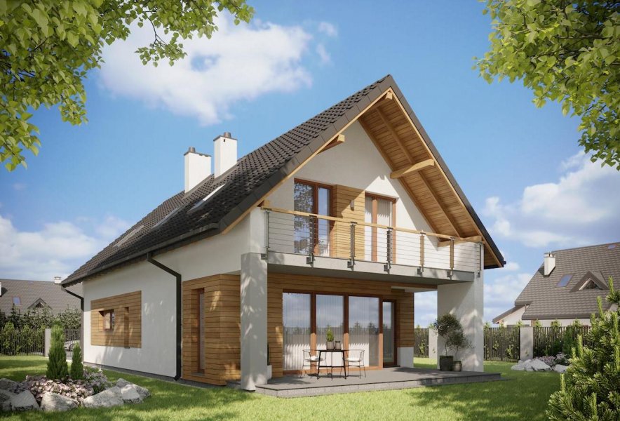 Na długą, wąska działkę (choć nie tylko!) doskonale nadaje się projekt domu z użytkowym poddaszem Lorena. Energooszczędna sylwetka z dwuspadowym dachem, zbudowana na planie zbliżonym do prostokąta, zwrócona jest do drogi dojazdowej ścianą ze szczytem. Umieszczono w niej wejście i wysunięty ku frontowi wjazd do garażu. Wygodna sień poprzedza dalej hol, który, w dalekiej perspektywie, zamyka widok przez duże przeszklenie salonu na ogród. Przejście do obszernego pokoju dziennego obejmuje z obu stron zespół gospodarczy z otwartą kuchnią i z dużą kotłownią wykorzystującą miejsce pod schodami. Na poddaszu rozlokowano cztery sypialnie i łazienkę dostępne ze zgrabnego przedpokoju. Projekt domu Lorena należy do bardziej ekonomicznych konstrukcji wśród rozwiązań o powierzchni ok. 130m2. Mimo prostoty, wydłużona bryła ma indywidualny, ciekawy charakter. Tworzy go przede wszystkim koncepcja loggii, osłoniętych głębokimi okapami w obu ścianach szczytowych i wspartych na słupach. Powstałe w ten sposób podcienie osłaniają: od fontu wejście główne, a od ogrodu wyjście z salonu i taras.