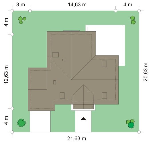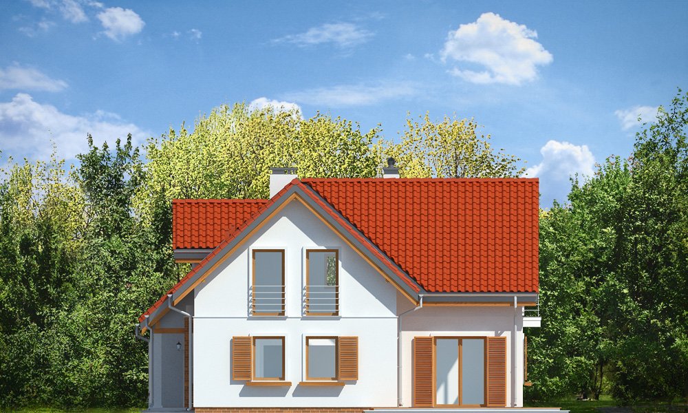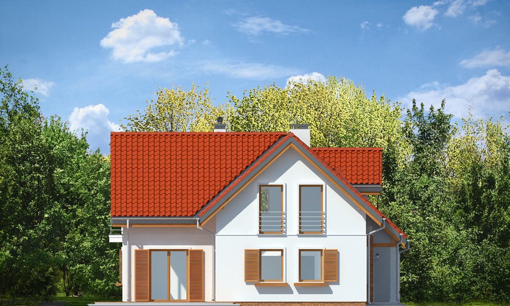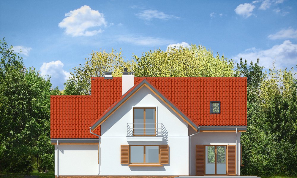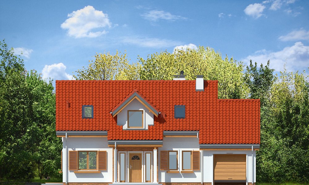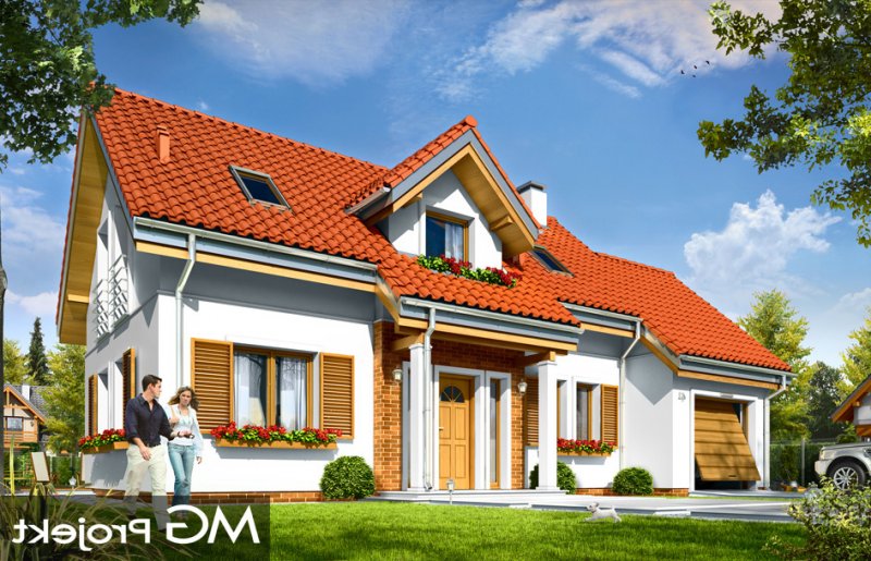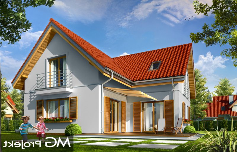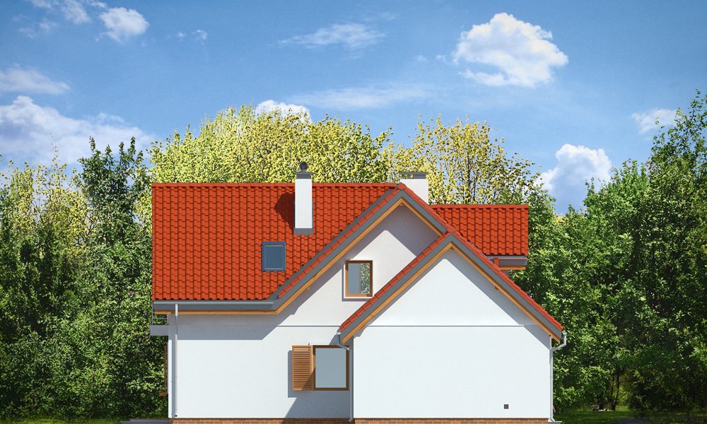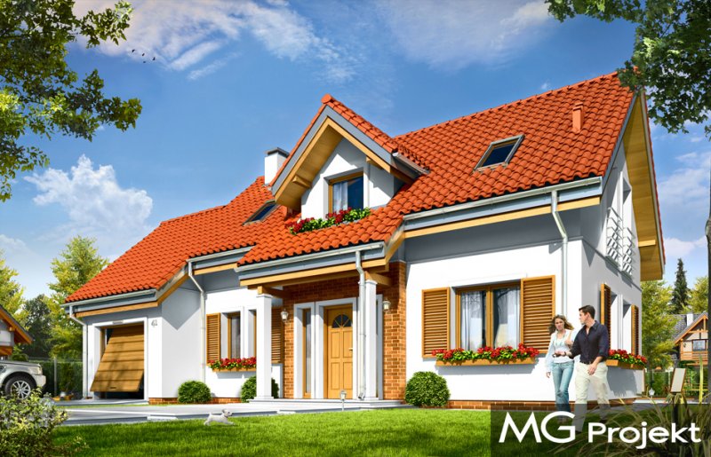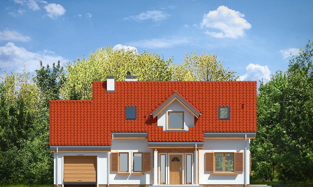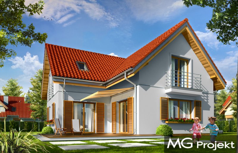 Lucky to dom jednorodzinny, dla 4-6cioosobowej rodziny, parterowy z użytkowym poddaszem, zaprojektowany na planie litery „L”, z osłoniętym z dwóch stron tarasem, oraz z dobudowanym garażem. Dom dzięki aż Czesiu pokojom doskonale nadaje się dla większej rodziny, z większą gromadką dzieci, bądź dla rodziny trzypokoleniowej. Architektura domu jest bezpretensjonalna - domek jest po prostu ładny. Udane proporcje i połączenie brył tworzy budynek o ludzkiej skali, nie przesadzony, który doskonale wpasuje się w każde otoczenie. Połączenie tradycyjnej stylistyki z nowoczesnymi materiałami i kolorystyką tworzą udany efekt. Parter domu to otwarta przestrzeń dzienna, z centralnym holem i dekoracyjnymi schodami, salon z kominkiem i ścianą TV, otwartą kuchnią i jadalnią. Razem pomieszczenia te tworzą jednoprzestrzenne duże wnętrze dzienne, ładnie otwarte na taras i ogród. Na parterze mamy dodatkowy pokój, łazienkę, kotłownię i garaż. Z kuchni dostępna jest spiżarnia. Na poddaszu zaprojektowano aż cztery pokoje, w tym osobny apartament rodziców z własną łazienką, garderobą i balkonem, oraz dużą łazienkę dla wszystkich domowników. Funkcjonalność wnętrza i sensowne wykorzystanie przestrzeni idzie w projekcie w parze z energooszczędnymi rozwiązaniami. Dom jest bardzo dobrze izolowany - w łatwy sposób można go dostosować do standardu NF40. Budynek ma prostą konstrukcję - będzie łatwy w budowie, a dzięki energooszczędności, niedrogi w późniejszym utrzymaniu. Zapraszamy !