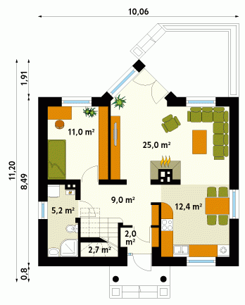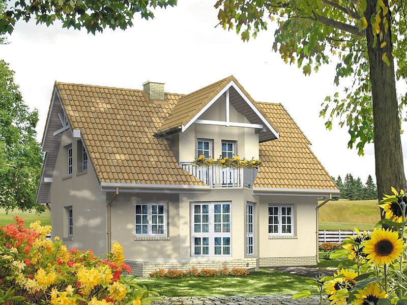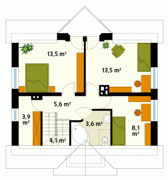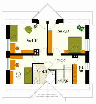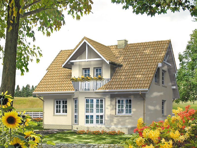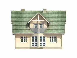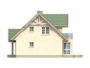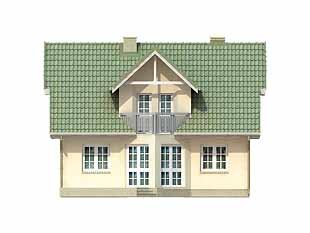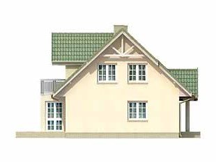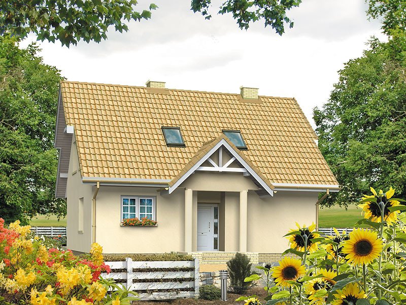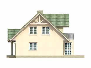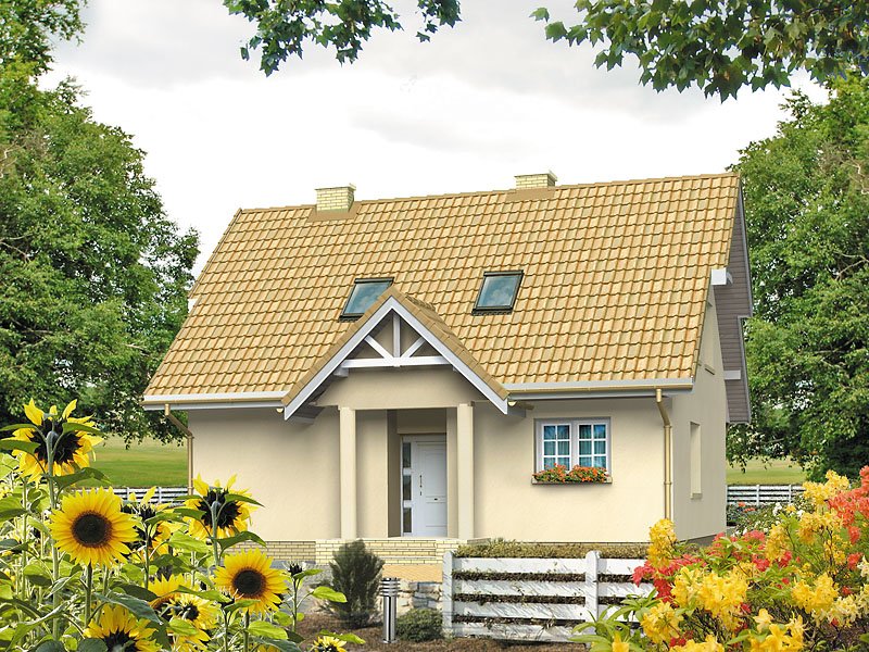 Dom jednorodzinny, parterowy z użytkowym poddaszem, niepodpiwniczony. Mały, zwarty, bardzo wygodny dom dla 4 osób. Na parterze dodatkowy pokój – gabinet lub pokój seniora, przestronna kuchnia z jadalnią oraz pokój dzienny z wykuszem przy tarasie. Na poddaszu sypialnie z niewielkim balkonem i garderobą.