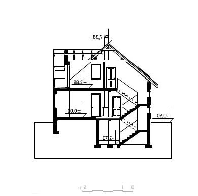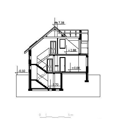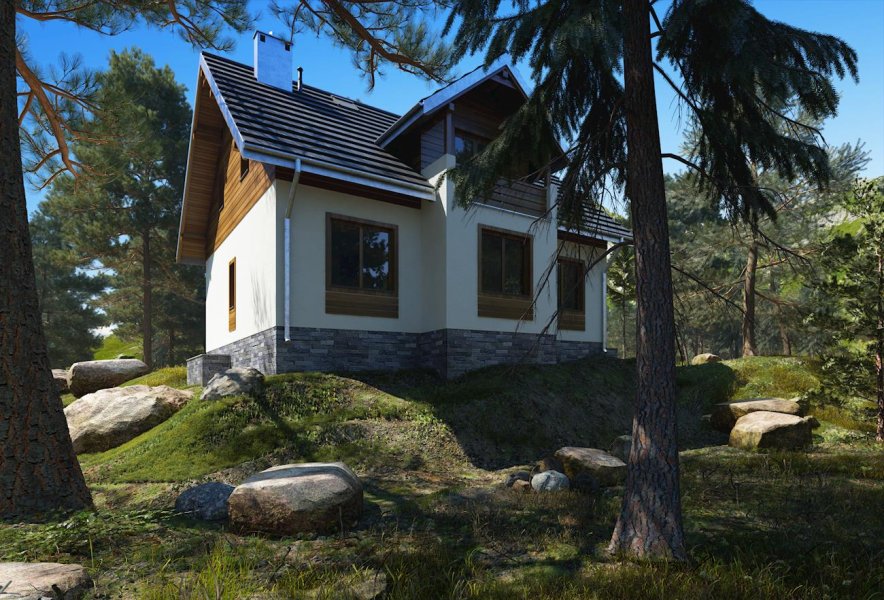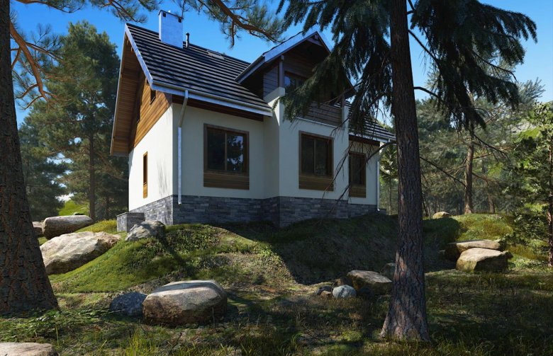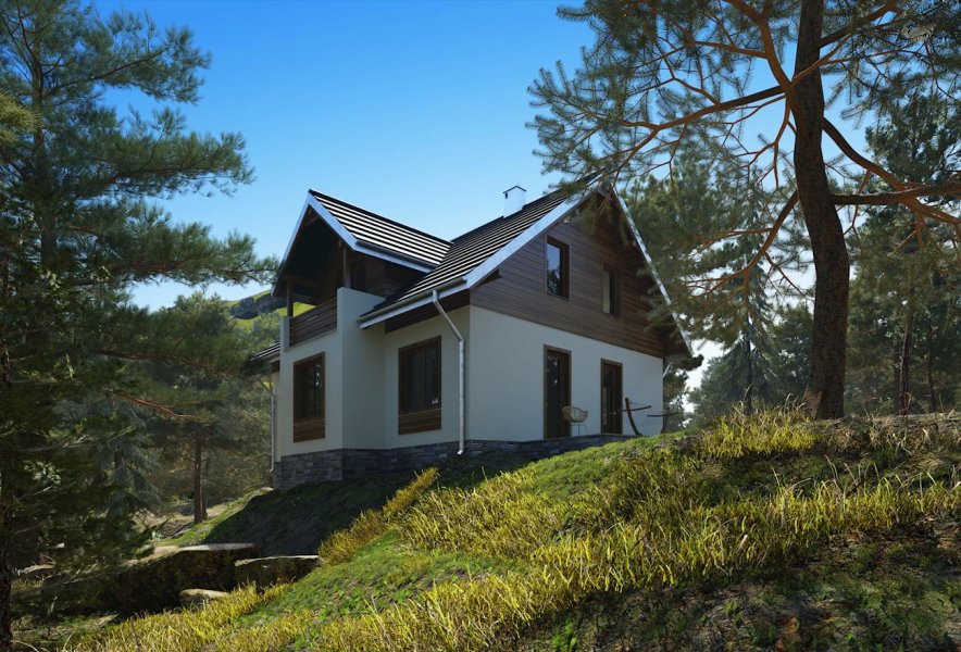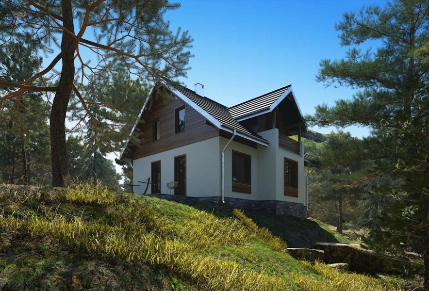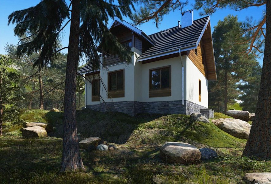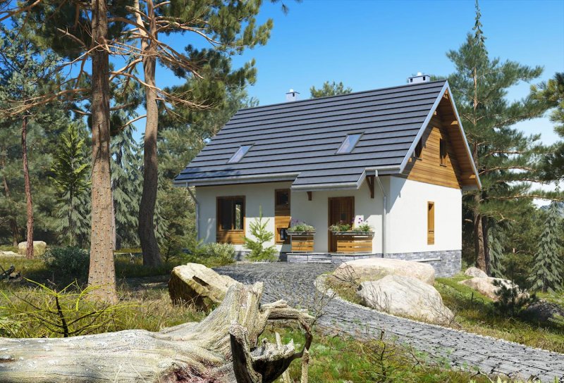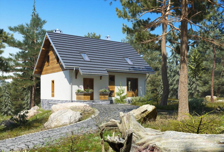 Do budynku wchodzimy przez obszerną sień prowadzącą do holu. Z holu możemy przejść na wprost do kuchni lub nieco w lewo - do pokoju dziennego, w którym umieszczono kominek. Na prawo z holu możemy wejść do łazienki, a na lewo do pokoju mogącego pełnić funkcję przestronnego gabinetu/pracowni lub sypialni. Schody obok pokoju prowadzą na poddasze, gdzie zaprojektowano 3 pokoje sypialne oraz łazienkę. W piwnicy mieści się kotłownia oraz pomieszczenia gospodarcze. Prosta, zwarta i ergonomiczna bryła domu zbudowana na rzucie prostokąta, przykryta dachem dwuspadowym o kącie nachylenia połaci wynoszącym 40°. Bryłę budynku urozmaicają drewniane wykończenia elewacji - deskowanie szczytów i opaski wokół okien.