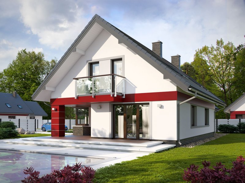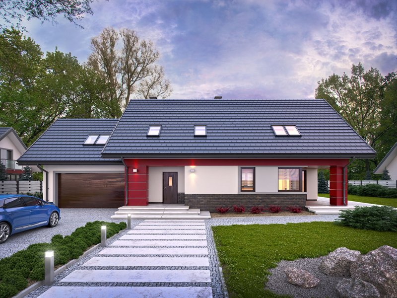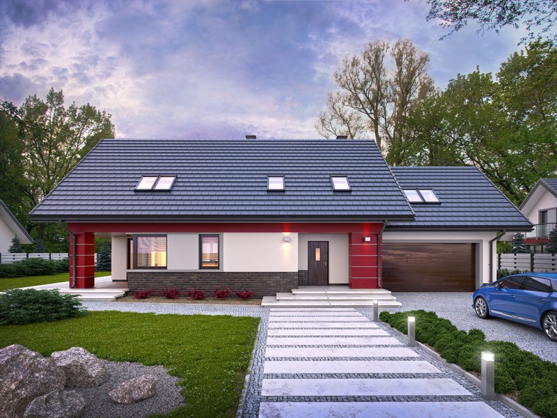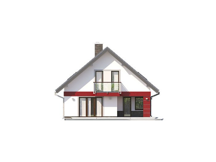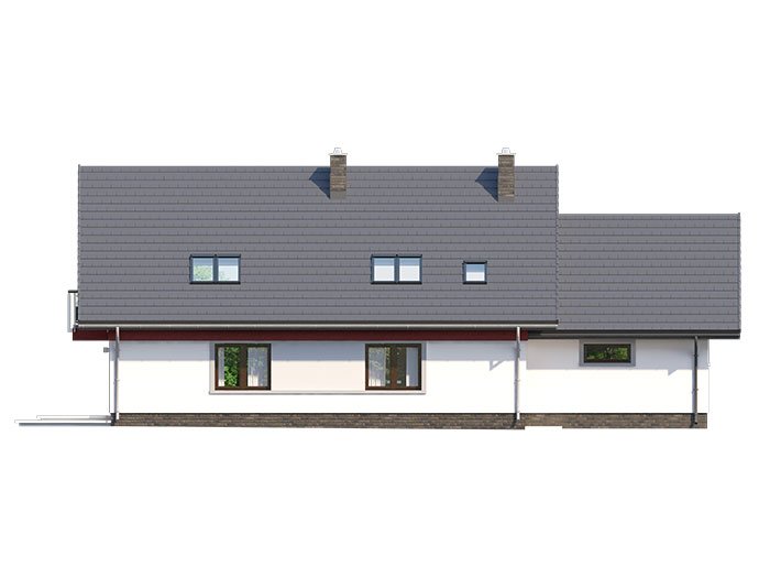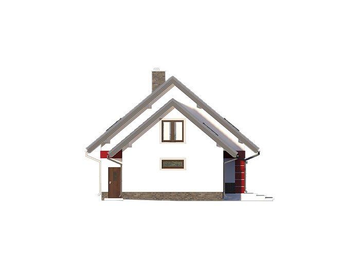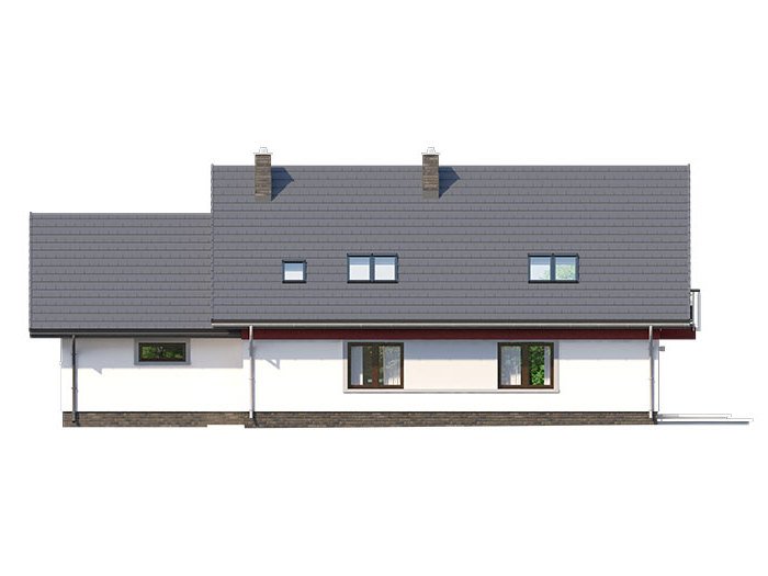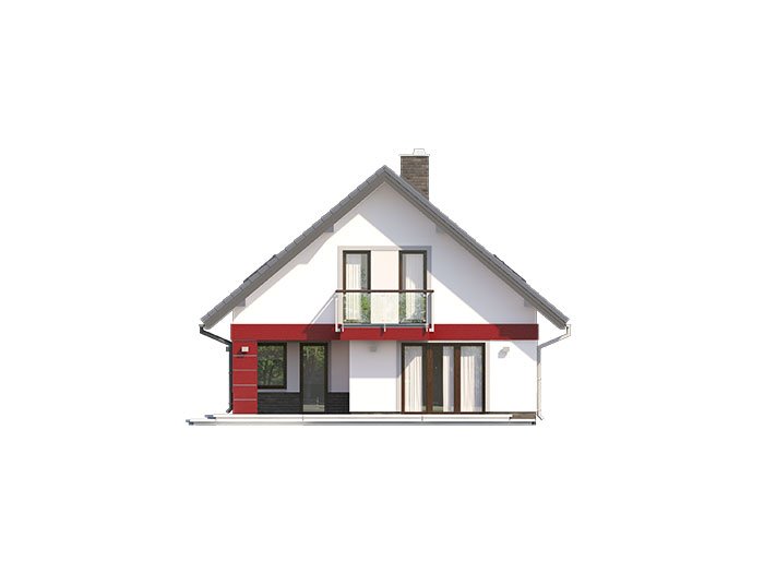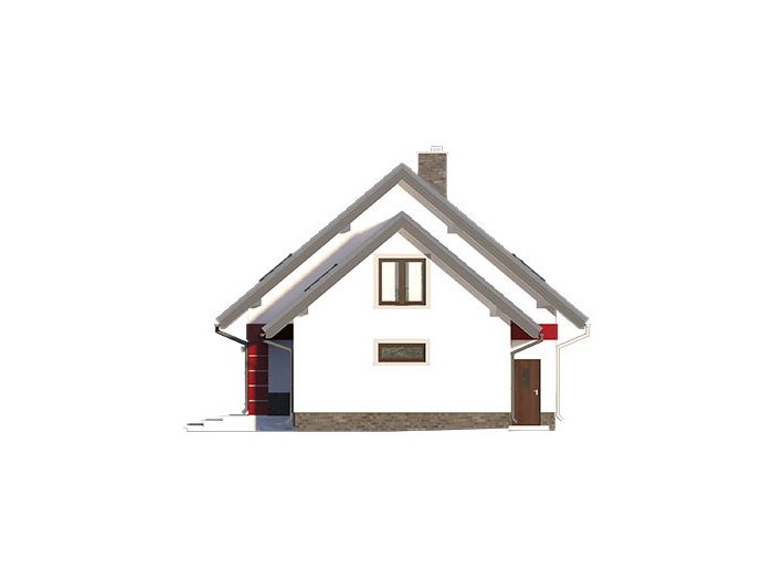 Dom jednorodzinny, parterowy z użytkowym poddaszem, z dwustanowiskowym garażem.W prostej bryle przykrytej dwuspadowym dachem zamknięto przestronne i funkcjonalne wnętrze. Obniżony strop nad garażem wydatnie powiększa przestrzeń w sypialni rodziców, która jest funkcjonalnie odizolowana od pokoi dzieci. Daje to poczucie spokoju oraz intymności. W domu przewidziano miejsce na spiżarnię i pralnię. Kotłownia dostępna zarówno z garażu jak i z zewnątrz.
