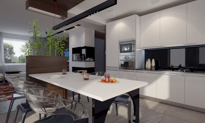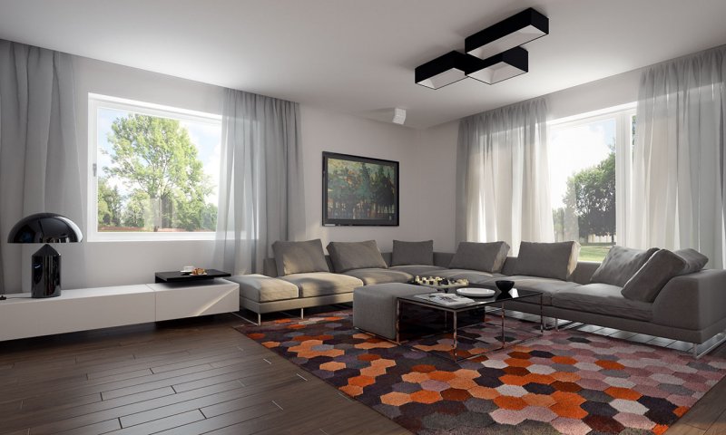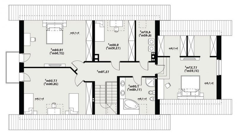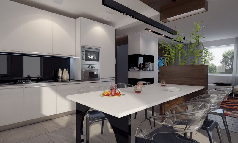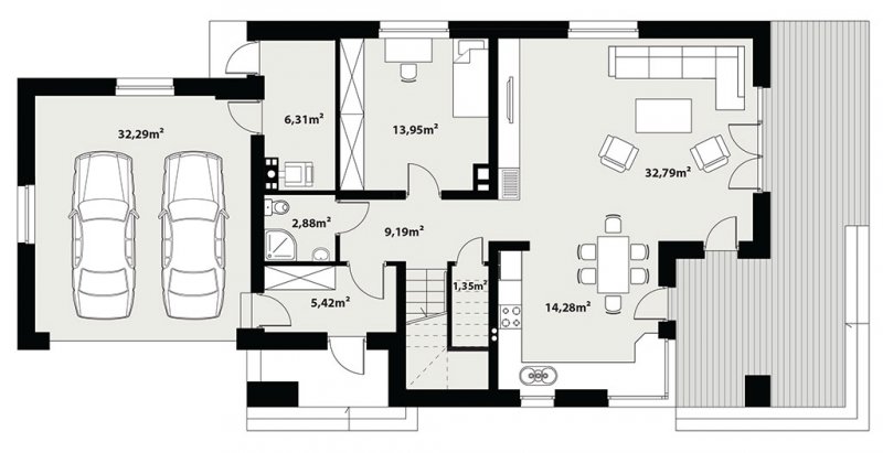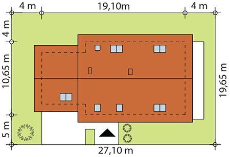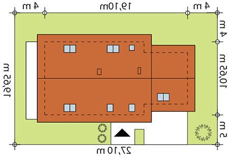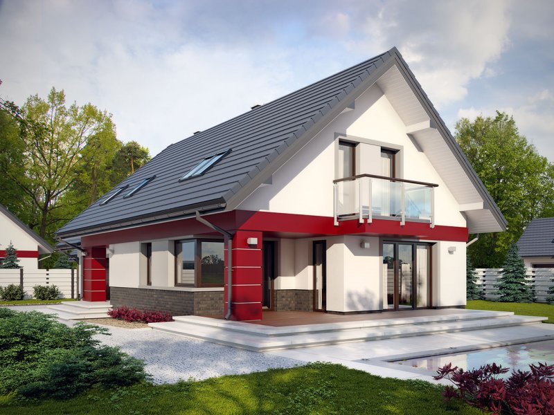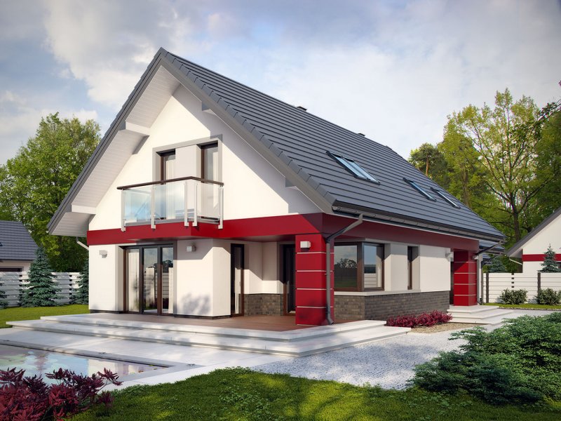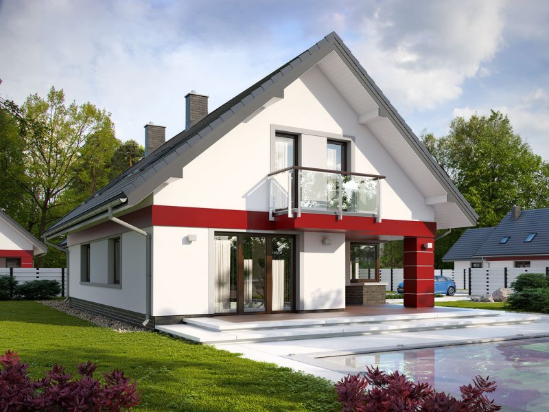 Dom jednorodzinny, parterowy z użytkowym poddaszem, z dwustanowiskowym garażem.W prostej bryle przykrytej dwuspadowym dachem zamknięto przestronne i funkcjonalne wnętrze. Obniżony strop nad garażem wydatnie powiększa przestrzeń w sypialni rodziców, która jest funkcjonalnie odizolowana od pokoi dzieci. Daje to poczucie spokoju oraz intymności. W domu przewidziano miejsce na spiżarnię i pralnię. Kotłownia dostępna zarówno z garażu jak i z zewnątrz.
