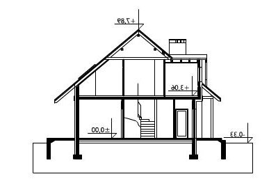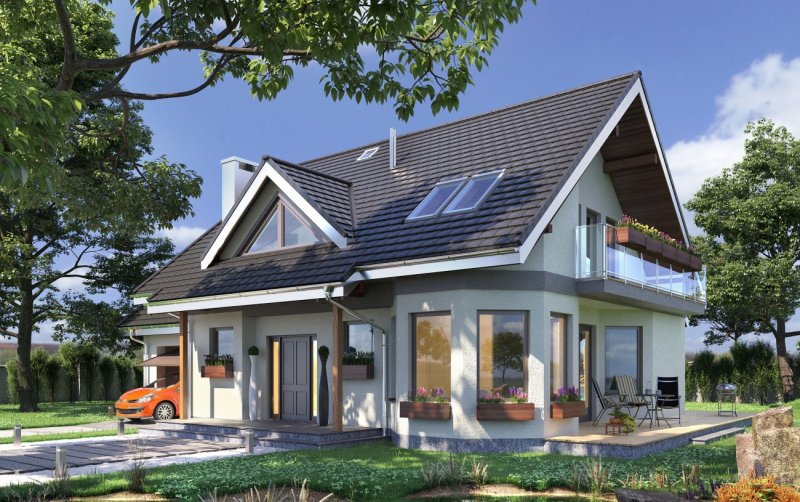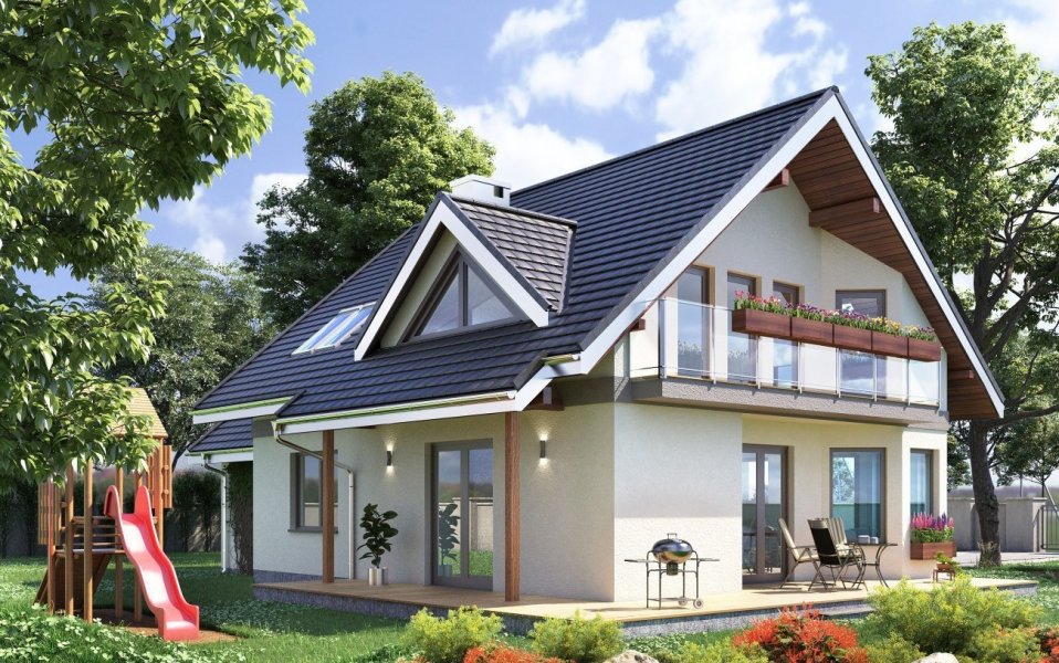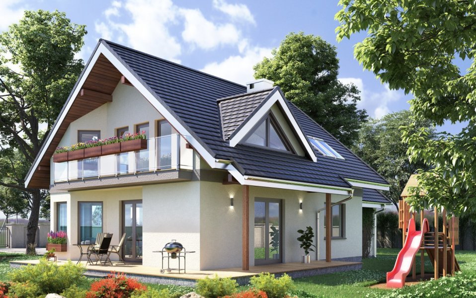 Przez wygodny wiatrołap wchodzimy do holu, z którego po prawej stronie dostajemy się do pokoju dziennego z kominkiem i dalej do kuchni z jadalnią, na wprost mamy łazienkę i mały pokój, po lewej stronie wchodzimy do kotłowni przez którą możemy się dostać do garażu. Krętymi drewnianymi schodami dostajemy się na poddasze, gdzie zlokalizowano trzy pokoje oraz dużą wygodną łazienkę z wydzieloną pralnią. Dodatkowo pokój nr 2 posiada garderobę. Nad garażem znajduje się strych do którego możemy wejść po schodach drabiniastych z garażu. Prosta, energooszczędna bryła budynku zbudowana na rzucie prostokąta nakryta dachem głównym dwuspadowym o kacie nachylenia połaci 40°. Bryłę urozmaicają: podcień wejściowy oraz wysunięta, zbudowana na rzucie ośmiobocznym jadalnia oraz duży balkon. Wejście zostało zaakcentowane poprzez wysunięcie zadaszenia budynku oraz centralnie umieszczoną lukarnę.