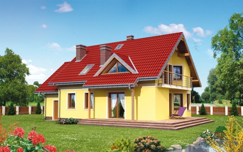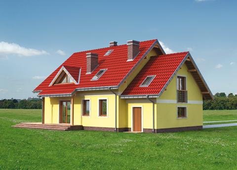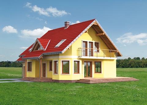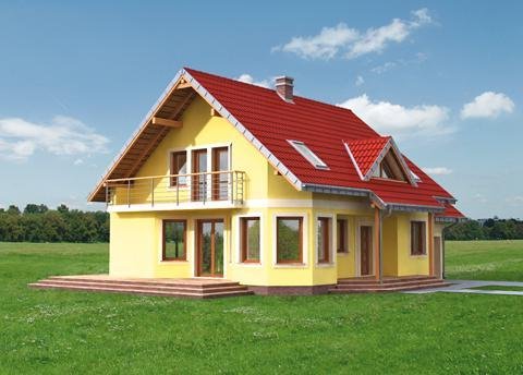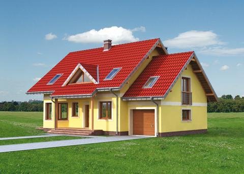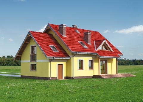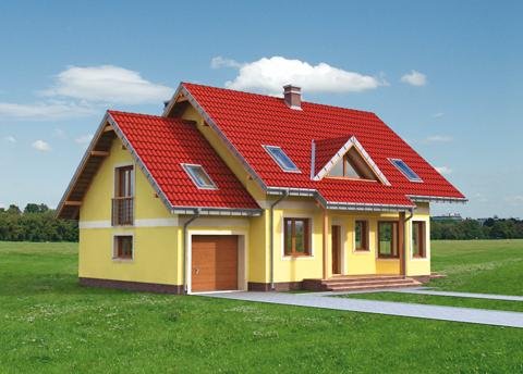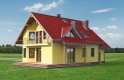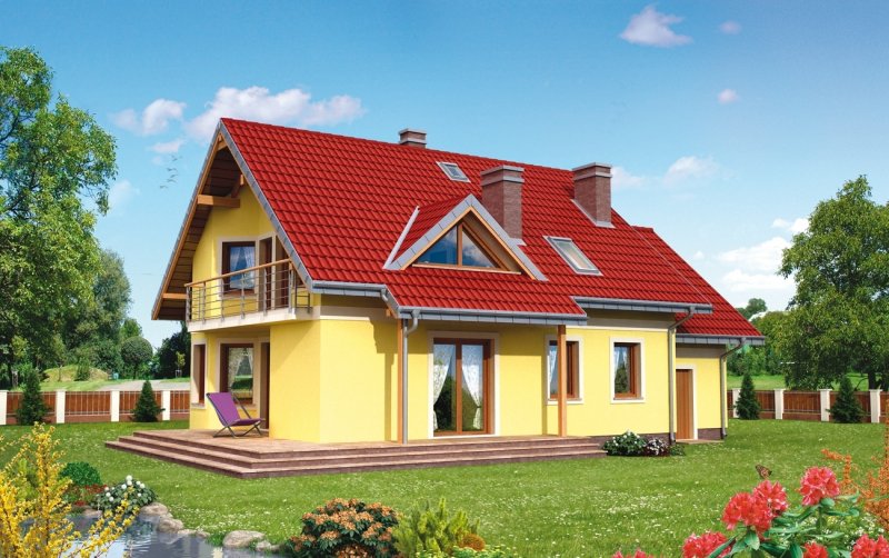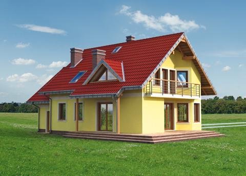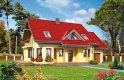 Projekt domu Maja Bona ma średnią wielkość w liczącej kilkanaście wariantów rodzinie, którą, wśród małych i średnich domów z dobudowanym garażem, wyróżnia fantazyjna sylwetka z narożnym ryzalitem na planie ośmioboku oraz trójkątna lukarna od frontu. Przełamanie geometrii kąta prostego kształtuje także inne detale bryły: zadaszoną wnękę wejścia, taras przy ścianie bocznej i ocieniający go balkon. Rozkład wnętrza przypomina pozostałe koncepcje, które budowane są na takim samym obrysie przy zmieniających się wymiarach. Pokój dzienny urozmaica ośmiokątna jadalnia przy kuchni, a salon, choć otwarty, jest wydzielony od holu. Dwubiegowe schody ulokowano w środku planu, przy przejściu do garażu, rozdzielając nimi: od frontu - dodatkowy pokój, a od ogrodu - dużą kotłownię i łazienkę. Strefa nocna na poddaszu pozwala na indywidualną aranżację prywatnej przestrzeni dla 5 osób, bo każda z czterech sypialni ma inny kształt i sposób doświetlenia. Projekt domu Maja Bona, jak większość w rodzinie, ma osobne dwuspadowe dachy nad częścią mieszkalną i garażem. Najbardziej zbliżona do niego jest Maja Rex Grota - z piwnicą i bez podcienia na słupkach nad wejściem.