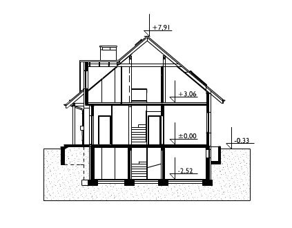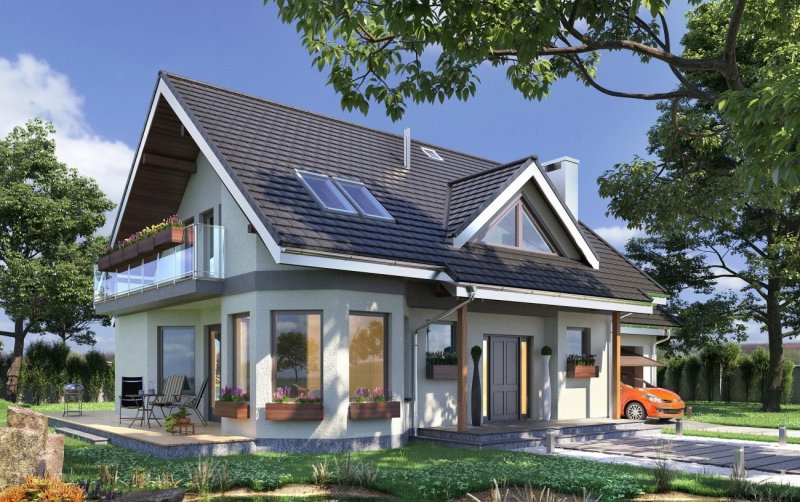 Projekt domu Maja Grota jest jednym z najmniejszych w liczącej kilkanaście wariantów Rodzinie Mai, zbliżonej do Rodziny Majki. Obie wyróżnia, wśród małych i średnich domów z dobudowanym garażem, fantazyjna sylwetka z narożnym, oktagonalnym ryzalitem. Przełamanie geometrii kąta prostego kształtuje przylegające do niego detale bryły: zadaszoną wnękę wejścia, taras dostępny z salonu przy ścianie bocznej i ocieniający go balkon. Rozkład wnętrza w projekcie domu Maja Grota przypomina wszystkie koncepcje Mai i Majki. Pokój dzienny urozmaica ośmiokątna jadalnia przy kuchni ale salon jest bardziej przysłonięty od holu, a zabiegowe schody rozrysowano na układzie dwóch biegów. Pozostałe wersje proponują większe powierzchnie mieszkania i garażu, różne umiejscowienie kotłowni i dodatkowy pokój na parterze. Strefa nocna na poddaszu pozwala na indywidualną aranżację prywatnej przestrzeni dla domowników, bo każdy z trzech pokoi Mai ma inny kształt i sposób doświetlenia. Projekt domu Maja Grota, jak większość w rodzinie, ma osobne dachy nad częścią mieszkalną i garażową ale jako jedyny z mniejszych wariantów proponuje pełne podpiwniczenie z kotłownią.