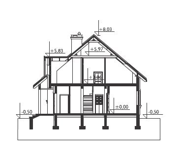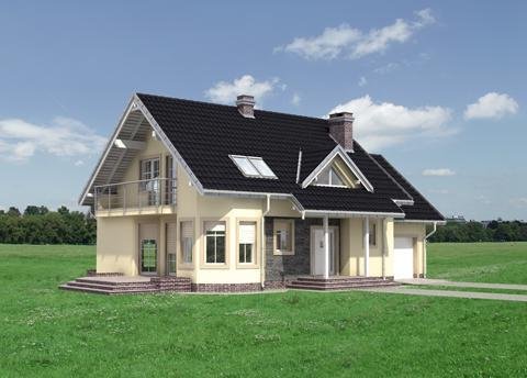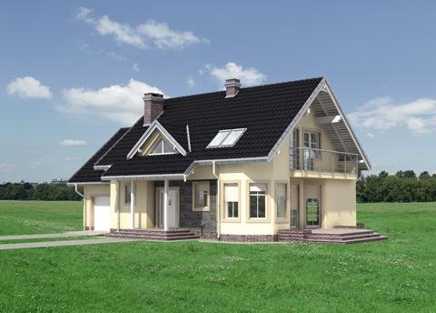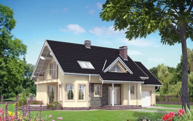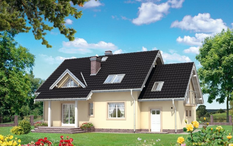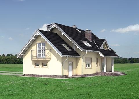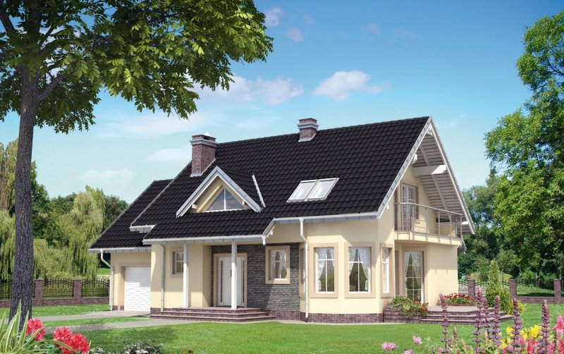 Projekt domu Maja Neo ma średnią wielkość w rodzinie, którą, wśród niedużych domów z dobudowanym garażem, wyróżnia fantazyjna sylwetka z narożnym ryzalitem na planie ośmioboku oraz trójkątna lukarna od frontu. Przełamanie geometrii kąta prostego kształtuje także taras przy ścianie bocznej i ocieniający go balkon. Rozkład wnętrza przypomina pozostałe koncepcje, które budowane są na takim samym obrysie przy zmieniających się wymiarach. Pokój dzienny urozmaica ośmiokątna jadalnia przy kuchni, a salon, choć otwarty, jest wydzielony od holu. Dwubiegowe schody ze schowkiem pod spocznikiem ulokowano w środku planu rozdzielając nimi: od frontu – kotłownię z przejściem do garażu, a od ogrodu – niewielki pokój i łazienkę. Strefa nocna na poddaszu pozwala na indywidualną aranżację czterech pokoi o zróżnicowanym kształcie i sposobie doświetlenia. Projekt domu Maja Neo, jak większość w rodzinie, ma osobne dwuspadowe dachy nad częścią mieszkalną i garażową. Bardziej dekoracyjną stylistykę i alternatywną, jednorodną konstrukcję ścian zewnętrznych proponuje, przy bardzo zbliżonych gabarytach, powierzchni i programie użytkowym projekt domu Maja Lux.