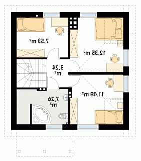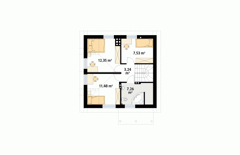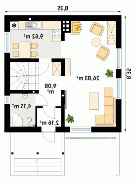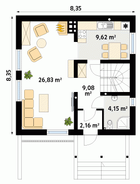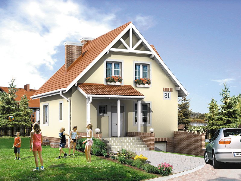 Dom parterowy z użytkowym poddaszem, podpiwniczony. Na parterze wygodny, doskonale doświetlony salon. Dom ten wyróżnia się optymalnym wykorzystaniem powierzchni użytkowej i małymi wymiarami, co pozwoli na wybudowanie go nawet na wąskiej działce.