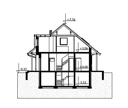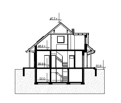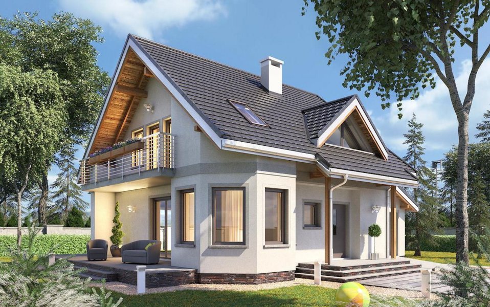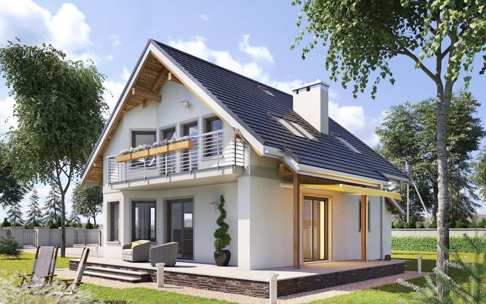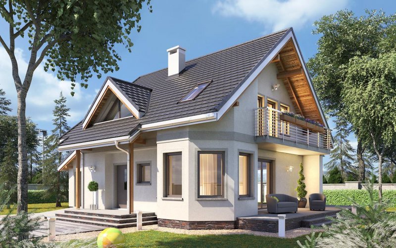 Projekt domu Majka Grota jest jednym z mniejszych wariantów Rodziny Majki. Wśród małych i średnich parterowych domów z użytkowym poddaszem i dobudowanym garażem, warianty te zwracają uwagę trójkątną lukarną i fantazyjnym narożnym ryzalitem na planie ośmioboku. Przełamanie geometrii kąta prostego kształtuje dalej inne elementy bryły: zadaszoną wnękę wejścia na drewnianych słupkach, taras przy ścianie bocznej i ocieniający go balkon. Rozkład wnętrza oparto na sprawdzonych schematach, ale dodano kilka oryginalnych rozwiązań. Pokój dzienny urozmaica ośmiokątna jadalnia przy kuchni i widok na trójbiegowe schody w otwartym holu. Projekt domu Majka jest wersją z kalenicą dwuspadowego dachu równoległą do drogi dojazdowej i nie oferuje przy salonie dodatkowego pokoju tak, jak np. większa Majka Puzon. Miejsce to zajmuje przechodnie pomieszczenie gospodarcze, a kotłownia jest w podpiwniczeniu części mieszkalnej. W pozostałej wolnej przestrzeni przy schodach mieści się tylko wc. Strefa nocna na poddaszu, pozwala na indywidualną aranżację prywatnej przestrzeni dla domowników, bo każdy z trzech pokoi dla czterech osób ma inny kształt i sposób doświetlenia.