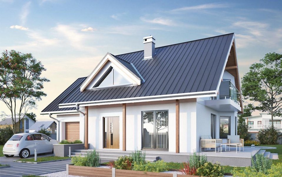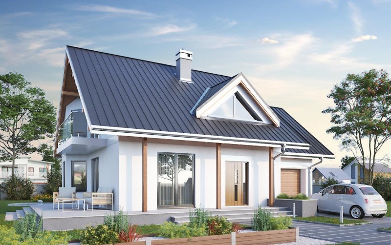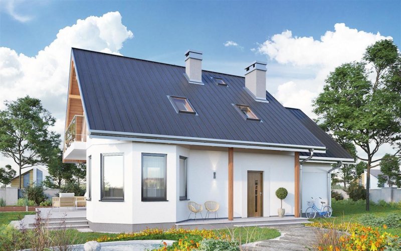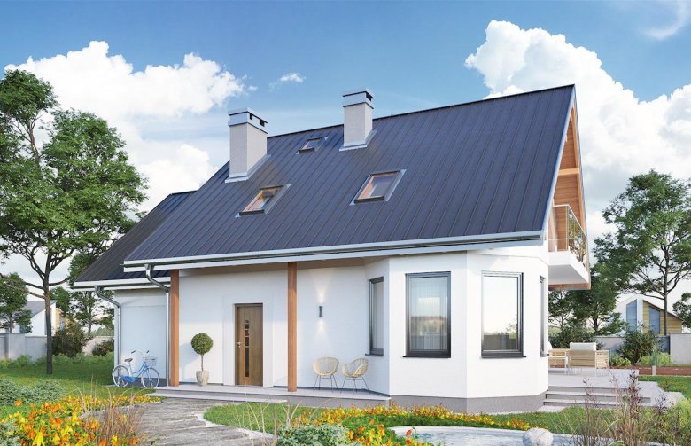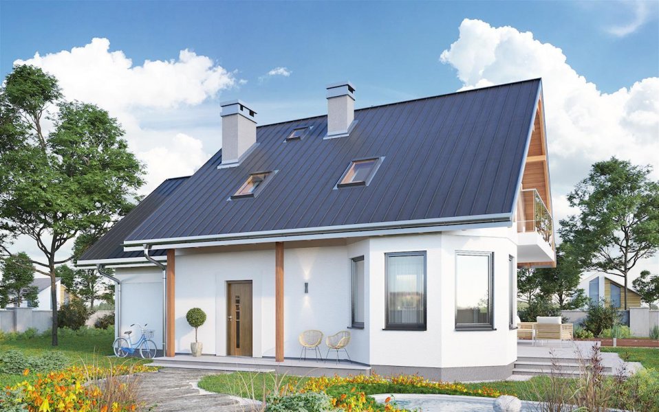 Projekt domu Majka Solis jest średnim w liczącej kilkanaście wariantów Rodzinie Majki. Wśród niewielkich parterowych domów z użytkowym poddaszem i dobudowanym garażem, przykuwają one uwagę sylwetką z trójkątną lukarną nad wejściem i fantazyjnym narożnym ryzalitem na planie ośmioboku. Majka Solis jest wersją, w której ryzalit ten, wraz z jadalnią i kuchnią, znalazł się w ogrodowej części budynku. Rozwiązanie to, przeznaczone na działkę z wjazdem od południa, zachowuje poza tym charakterystyczny rozkład parteru z jednoprzestrzennym pokojem dziennym, trójbiegowa klatką schodową i kotłownią dostępną z garażu, choć ulokowaną w części mieszkalnej budynku. Podobny jest także kształt tarasu przy ścianie bocznej i balkonu opartego o ryzalit. Projekt domu Majka Solis jest wariantem z kalenicą dwuspadowego dachu równoległą do drogi dojazdowej i frontowym podcieniem na słupkach. Ma pełną, małą łazienkę na parterze i jest najmniejszą wersją z czwartą – główną sypialnią nad garażem. Strefa nocna na poddaszu w całej Rodzinie Majki, pozwala na indywidualną aranżację prywatnej przestrzeni dla domowników, bo każdy z pokoi ma inny kształt i sposób doświetlenia.