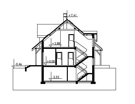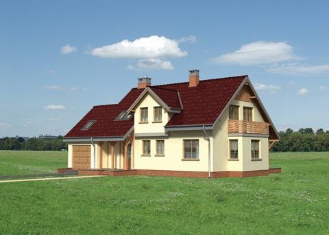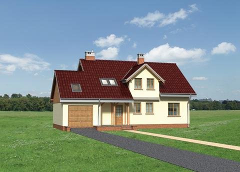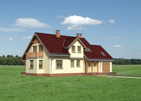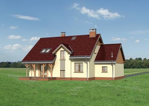Przez sień dostajemy się do holu, z którego na lewo wchodzimy do spiżarki, kuchni z jadalnią i pokoju dziennego. Po prawej stronie mamy łazienkę i gabinet. Z sieni możemy wejść bezpośrednio do garażu. Po schodach dostajemy się na poddasze gdzie znajdują się 3 wygodne pokoje i duża łazienka. Jeden z pokoi połączony jest z pomieszczeniem gospodarczym nad garażem. W części podpiwniczonej budynku znajduje się kotłownia z pralnią i dodatkowe pomieszczenie gospodarcze. Dom charakteryzuje dosyć prosta bryła o wydłużonym kształcie z wysuniętym garażem i częścią pokoju dziennego. Bryłę urozmaicają lukarny oraz podcienia przy wejściu i wyjściu na taras. Dodatkowym wzbogaceniem bryły budynku są drewniane elementy konstrukcyjne podcieni.