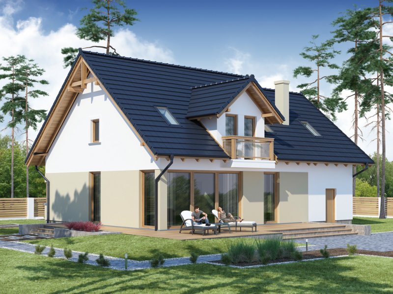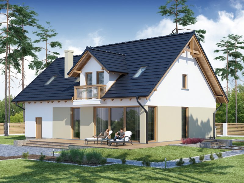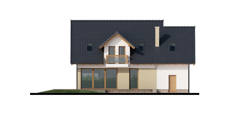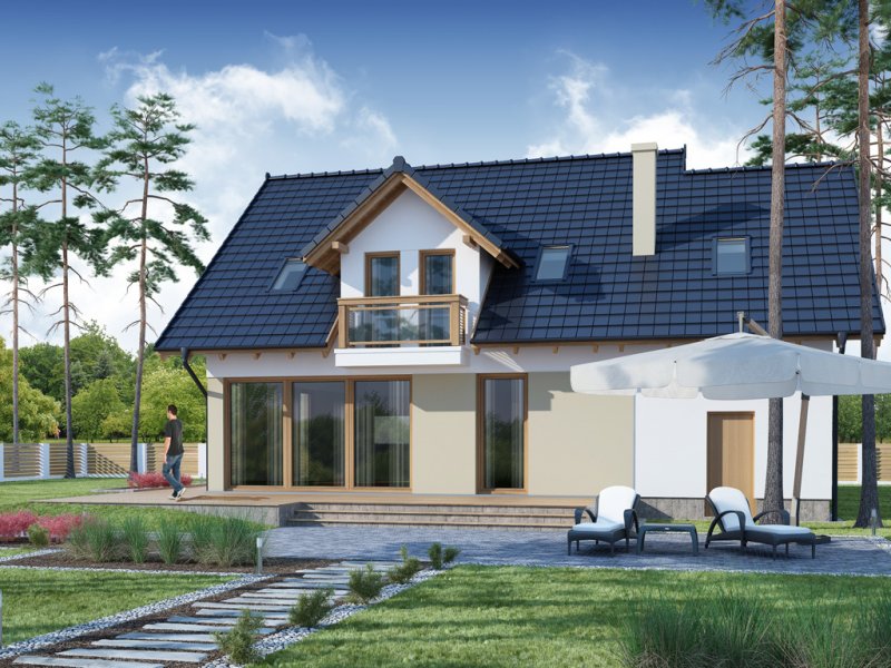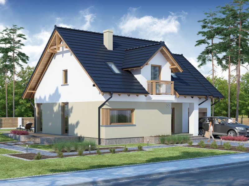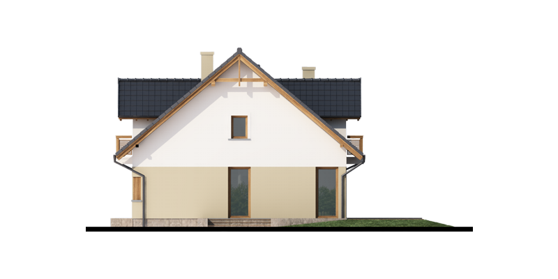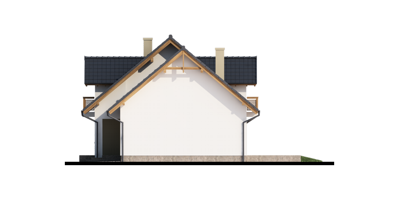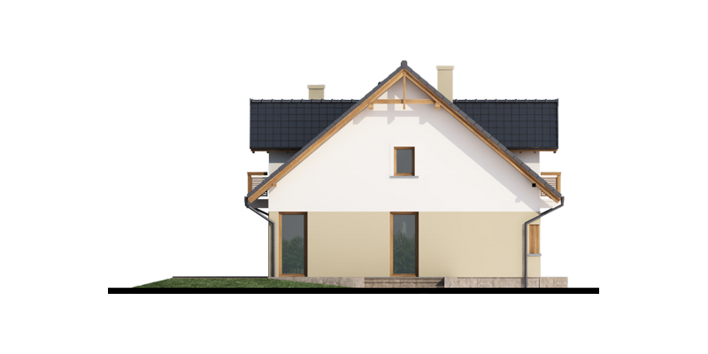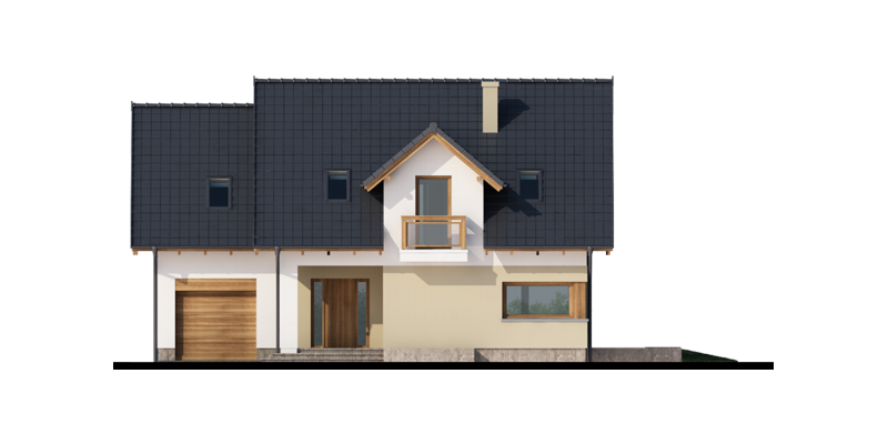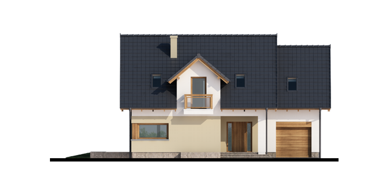 Maksym to wygodny dom parterowy z poddaszem użytkowym przeznaczony dla 4 osobowej rodziny. Dzięki dużym przeszkleniom cała przestrzeń jest dobrze doświetlona światłem słonecznym. Dom posiada widoczny podział na strefy: dzienną, gospodarczą oraz nocną. Ta pierwsza, to zlokalizowana na parterze otwarta przestrzeń, na którą składa się salon z kominkiem i jadalnią, a także kuchnia ze spiżarnią. Dzięki zastosowaniu ścianki działowej, zwolennicy kuchni zamkniętych mogą wydzielić samą kuchnię. Ustawny wiatrołap z szafami wnękowymi łączy strefę dzienną domu ze strefą gospodarczą, w skład której wchodzi jednostanowiskowy garaż z miejscem na ciąg regałów oraz pomieszczenie gospodarcze pełniące funkcję kotłowni, z dodatkowym wyjściem na ogród. Poddasze to w całości strefa nocna. Stanowią ją trzy sypialnie, każda z wyjściem na balkon. Dodatkowo na tym poziomie jest umieszczona ogólnodostepna z korytarza garderoba. Sypialnia dwuosobowa posiada także indywidualną łazienkę. Zaprojektowany jako nieużytkowy strych można zaadaptować na dodatkowy pokój sypialny, czy pokój hobby.