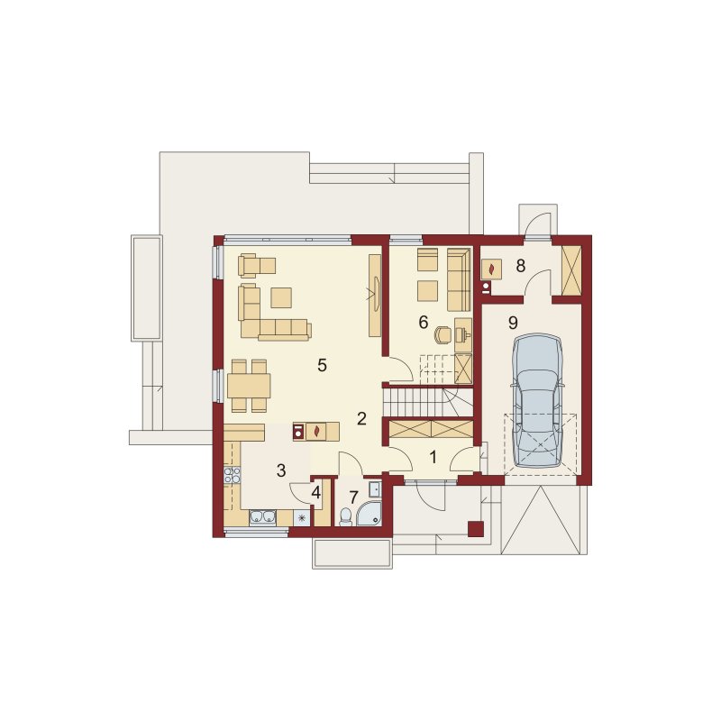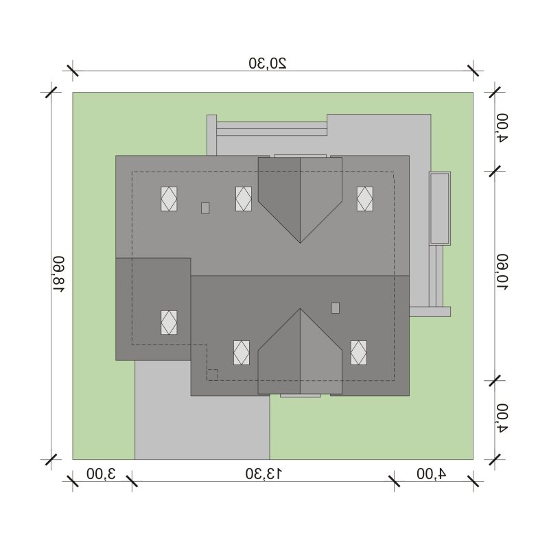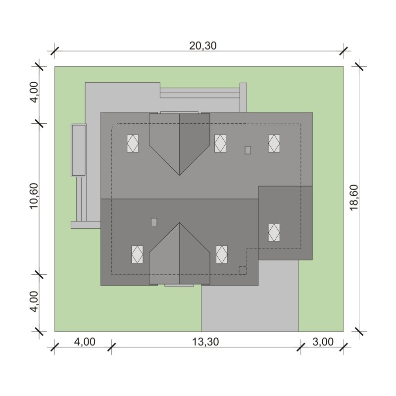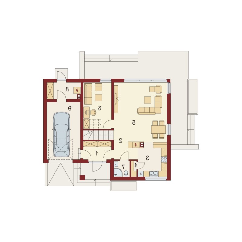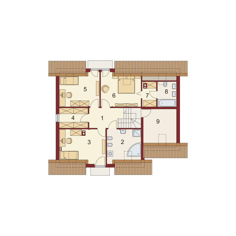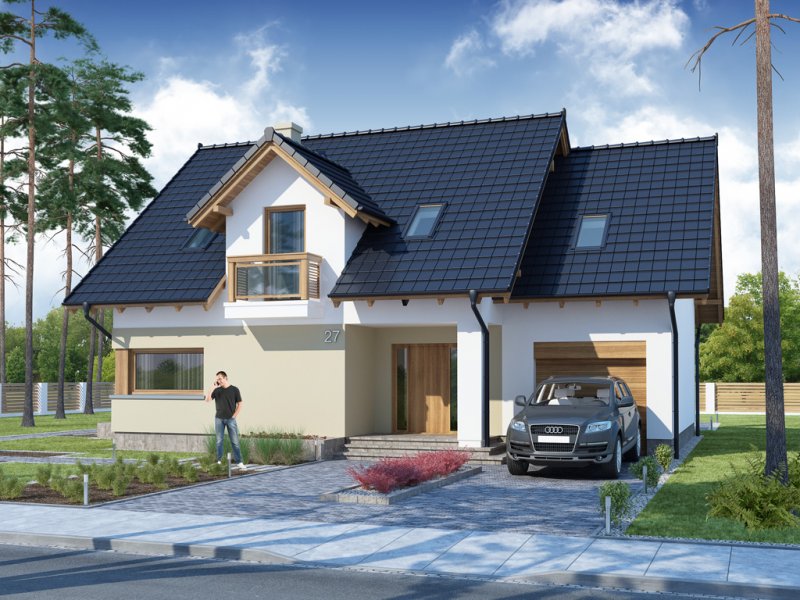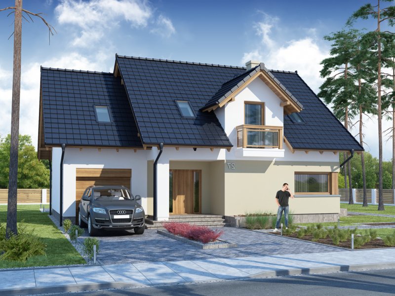 Maksym to wygodny dom parterowy z poddaszem użytkowym przeznaczony dla 4 osobowej rodziny. Dzięki dużym przeszkleniom cała przestrzeń jest dobrze doświetlona światłem słonecznym. Dom posiada widoczny podział na strefy: dzienną, gospodarczą oraz nocną. Ta pierwsza, to zlokalizowana na parterze otwarta przestrzeń, na którą składa się salon z kominkiem i jadalnią, a także kuchnia ze spiżarnią. Dzięki zastosowaniu ścianki działowej, zwolennicy kuchni zamkniętych mogą wydzielić samą kuchnię. Ustawny wiatrołap z szafami wnękowymi łączy strefę dzienną domu ze strefą gospodarczą, w skład której wchodzi jednostanowiskowy garaż z miejscem na ciąg regałów oraz pomieszczenie gospodarcze pełniące funkcję kotłowni, z dodatkowym wyjściem na ogród. Poddasze to w całości strefa nocna. Stanowią ją trzy sypialnie, każda z wyjściem na balkon. Dodatkowo na tym poziomie jest umieszczona ogólnodostepna z korytarza garderoba. Sypialnia dwuosobowa posiada także indywidualną łazienkę. Zaprojektowany jako nieużytkowy strych można zaadaptować na dodatkowy pokój sypialny, czy pokój hobby.