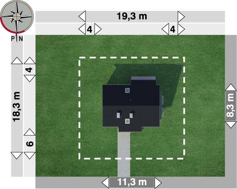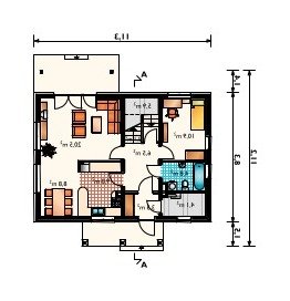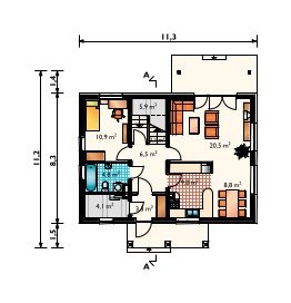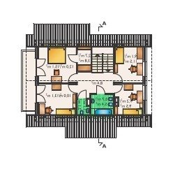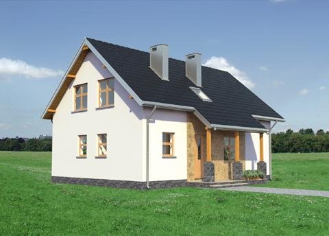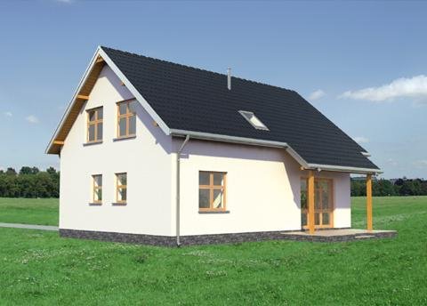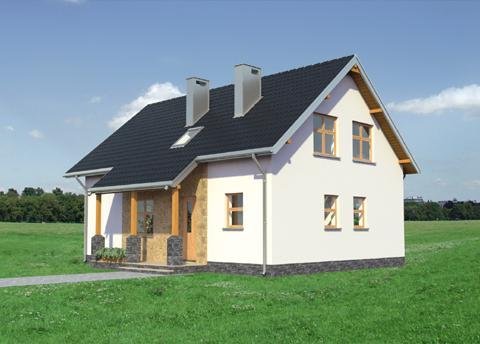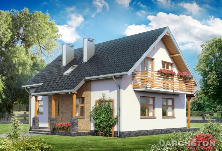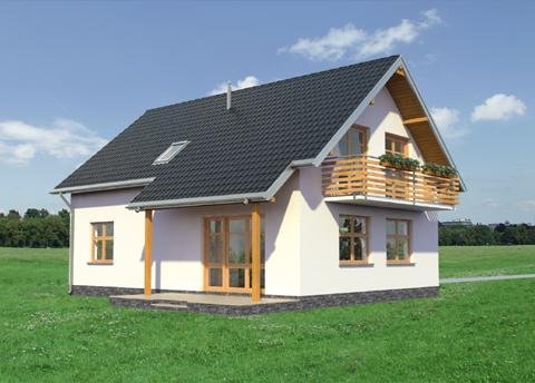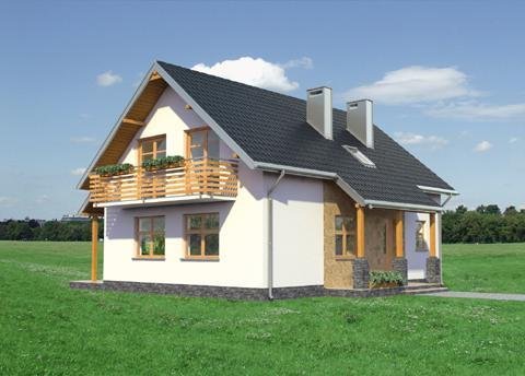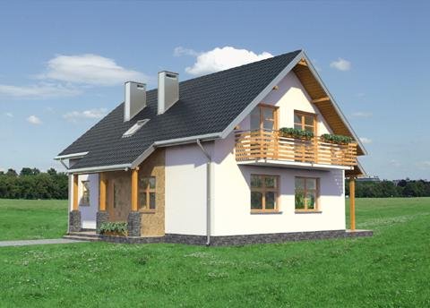 Dom parterowy, z użytkowym poddaszem, niepodpiwniczony. Przez korytarz wchodzimy do holu. Na parterze znajduje się pokój dzienny, jadalnia, kuchnia, pokój, łazienka, kotłownia i schowek. Na poddaszu - przedpokój, 4 sypialnie, łazienka, w.c. i garderoba. Prosta bryła nakryta dachem dwuspadowym o kącie nachylenia 40°. Budynek urozmaicają podcienia i balkon.