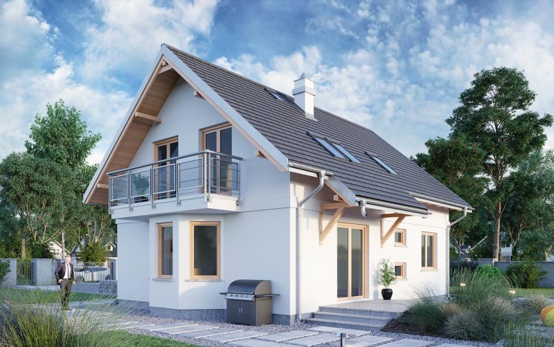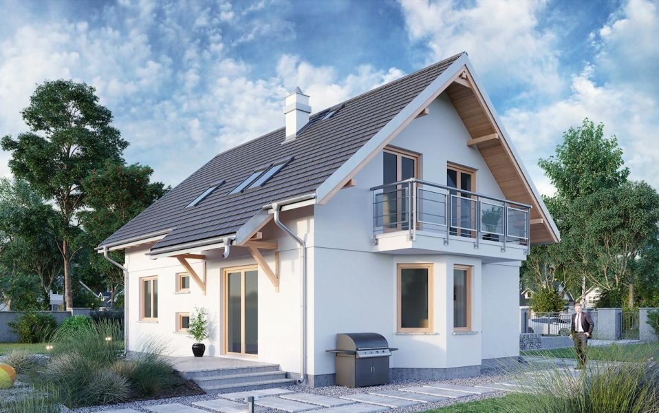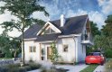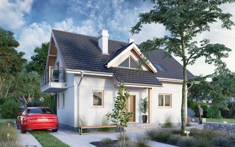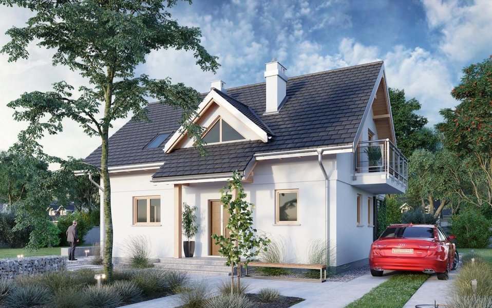 Malachit Polo to projekt domu parterowego z użytkowym poddaszem z grupy najbardziej ekonomicznych w realizacji koncepcji o powierzchni ok. 105m2 bez garażu. Tak jak zbliżone: Pączek, Kuklik i Sambor ma energooszczędny, prostokątny rzut i dwuspadowy dach z kalenicą równoległą do drogi dojazdowej. Układ kompletnego mieszkania na parterze (dodatkowy pokój przy salonie + łazienka) i kolejnych czterech pokoi na poddaszu ułatwia etapowanie budowy. Schemat konstrukcyjny jest nieskomplikowany i czytelnie rozdziela funkcje mieszkania dwoma poprzecznymi ścianami nośnymi. Detal podcienia frontowego z przedłużonego okapu na słupkach jest charakterystyczny dla wszystkich wariantów Malachita. Domy te proponują otwartą, nowoczesną strefę dzienną, a na poddaszu kolejną, większą łazienkę. W wersji Polo wzbogacono bryłę dodając nad wejściem trójkątną lukarnę, a w ścianie bocznej ryzalit z jadalnią na oktagonalnym zarysie, podpierający jeden z dwóch balkonów. Rozkład mieszkania i ten detal projektu domu Malachit Polo przypomina rozwiązania nieco większego projektu Sonia z garażem w piwnicy, który oferuje jednak tylko trzy, choć większe, pokoje na poddaszu.