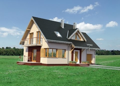 Rodzina Maliny to projekt małego domu parterowego z użytkowym poddaszem i z dostawionym garażem w kilku wariantach. We wszystkich rzut kwadratowej części mieszkalnej przekrywa dwuspadowy dach z kalenicą równoległą do drogi dojazdowej. Wymiary brył są takie same, a główne różnice widać w zadaszeniu krótszego traktu garażu. Projekt domu Malina jest większym w rodzinie i proponuje w tym miejscu, jak Malina Alfa, stromy dach dwuspadowy z dodatkową powierzchnią mieszkalną. Jednocześnie tak, jak w Malinie Bobo, ma w części głównej lukarnę oraz przedłużone okapy nad wejściami. Wszystkie wersje Maliny mają zbliżony rozkład i wielkość pomieszczeń. Sień łącząca mieszkanie z częścią gospodarczą prowadzi przez mały hol z łazienką do otwartej kuchni i salonu. Bardzo efektowne jest wejście na schody ze spocznikiem wprost z pokoju dziennego przy kominku. Jego trzony zblokowano z kominem kotłowni, dostępnej z garażu, ale znajdującej się w obrysie głównej bryły. Poddasze zagospodarowano na cztery sypialnie z dużą łazienką. Projekt domu Malina prezentuje tradycyjne rozwiązania plastyczne z balkonami i nowoczesnym detalem narożnego okna w kuchni.