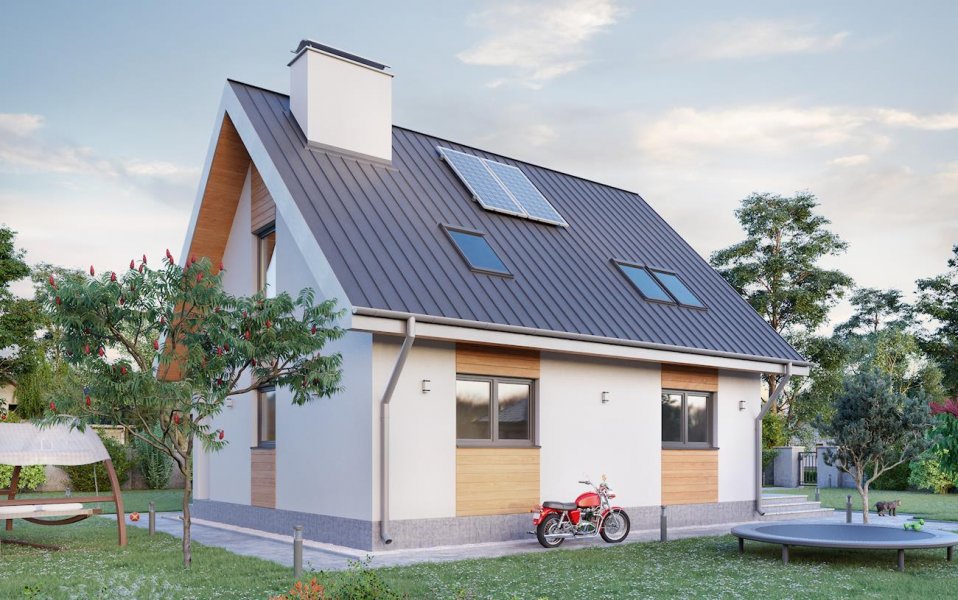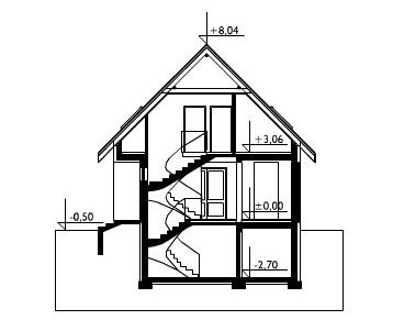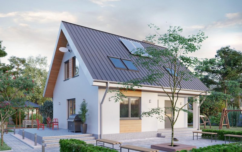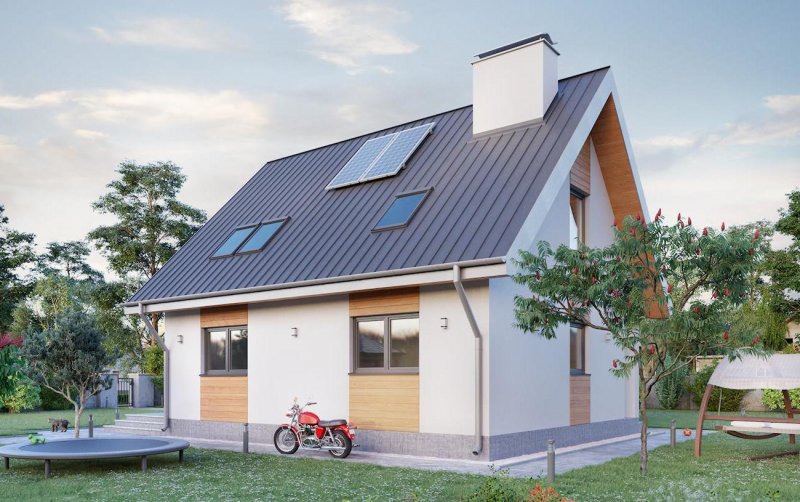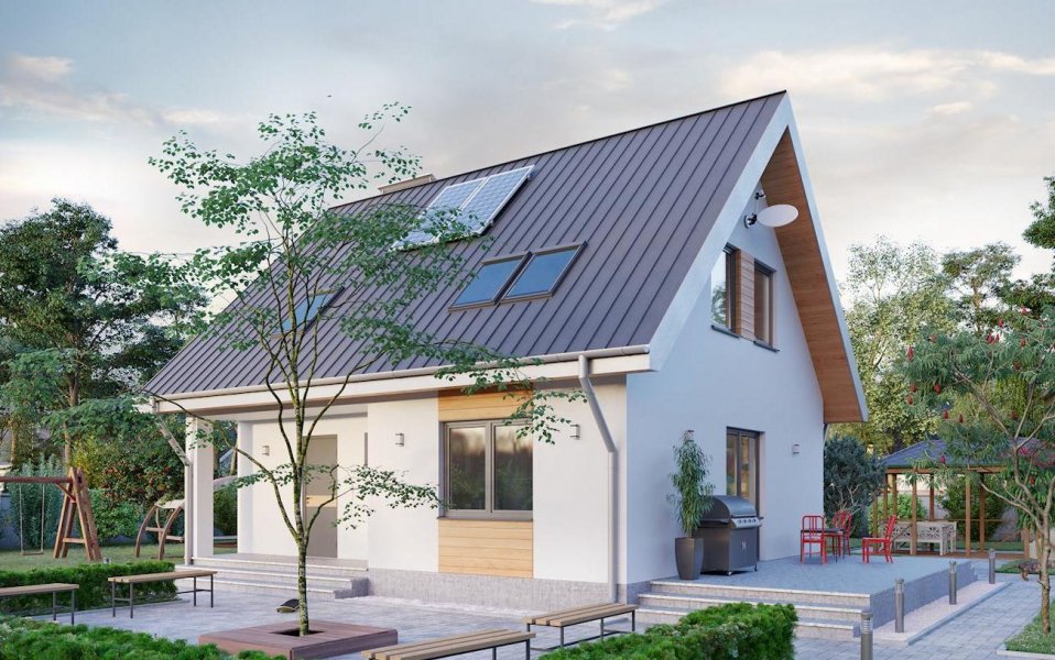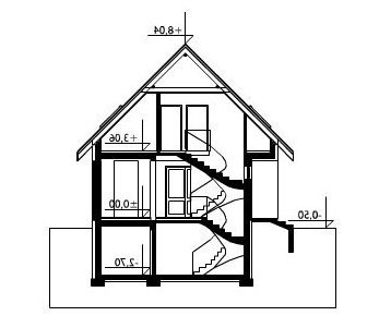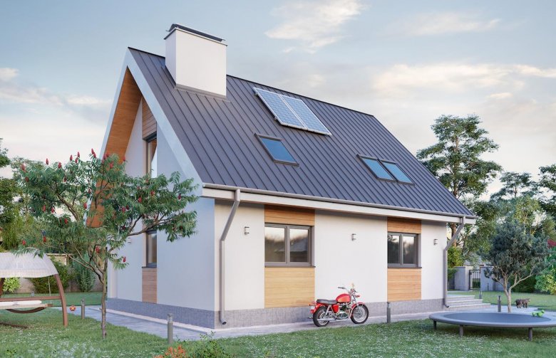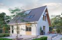 Budynek podpiwniczony, parterowy z poddaszem użytkowym. W piwnicy zaprojektowano kotłownię z pralnią oraz pomieszczenie magazynowe. Na parterze znajduje się sień z garderobą, hol, pokój dzienny połączony z kuchnią, łazienką. Na poddaszu zaprojektowano trzy sypialnie i ogólnodostępną łazienkę. Pokój dzienny o powierzchni powyżej 30 m2, zaproponowany w projekcie domu Malutek, to rzadkość w rozwiązaniach domów z użytkowym poddaszem nie większych niż 100m2 p.u. Budynek ma ponadto nietypowe położenie kuchni i jadalni od strony ogrodowej, przez co doskonale nadaje się na działkę z wjazdem od południa. Zabiegowe schody ulokowane blisko środka rzutu pozwalają maksymalnie wykorzystać poddasze na trzy sypialnie i dużą łazienkę. Prosta bryła z ekonomicznym i energooszczędnym dwuspadowym dachem bez lukarn urozmaicona jest tylko wejściową narożną wnęką ze słupem. O niedrogiej budowie Malutka decyduje również zblokowanie w jeden komin wszystkich pionów dla wentylacji i spalin (wentylacja mechaniczna z rekuperacją zwolni sporo miejsca!). Symetryczna kompozycja elewacji ułatwia osiągnięcie dobrego efektu plastycznego nawet najskromniejszymi środkami finansowymi. Projekt domu Malutek oferuje możliwość częściowego podpiwniczenia z kotłownią. Adaptacja, przy dogodnych warunkach gruntowych, pozwoli na garażowanie samochodu w drugiej części podziemia lub w wiacie przy ścianie bocznej.