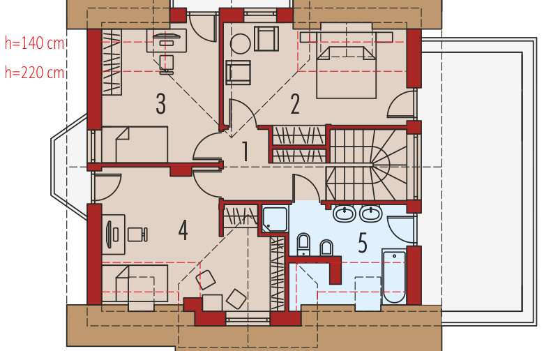 Dach: konstrukcja drewniana, ocieplenie wełna mineralna 30 cm, dachówka ceramiczna Röben