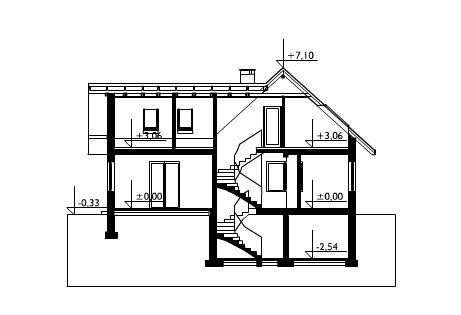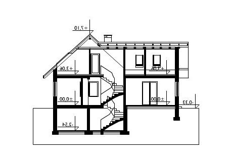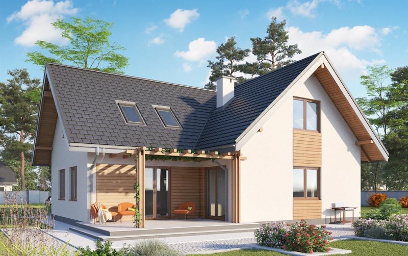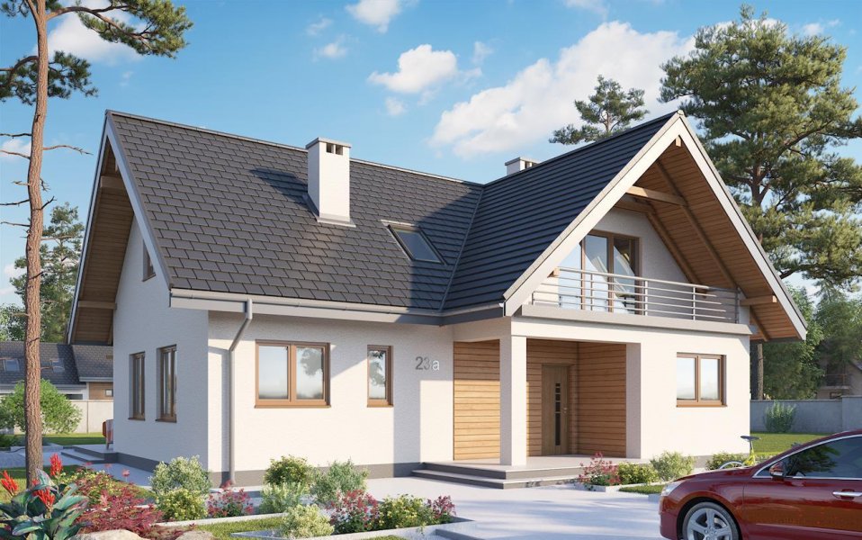 Dom dla rodziny dwupokoleniowej. Na parterze część dzienna oraz małe, dodatkowe mieszkanie. W częściowym podpiwniczeniu mieści się kotłownia i pralnia. Na poddaszu zaprojektowano trzy wygodne sypialnie, garderobę i dwie łazienki. Dom ma prostą bryłę opartą na literze"T" oraz dach dwuspadowy o nachyelniu połaci 42°. Od frontu domku zaakcentowane podcieniem wejście, na poddaszu przestronna loggia. Od strony ogrodowej jest taras z ażurowym zadaszeniem - pergolą.