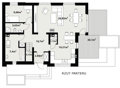 Czego potrzebuje standardowa polska rodzina? Tradycyjnego, wygodnego domu, w którym znajdzie jasną przestrzeń. Dom Medea o powierzchni 149,75m2 całkowicie spełnia powyższe wymagania. Na parterze znajduje się przestronna kuchnia połączona z jadalnią, gdzie spokojnie można umieścić stół dla całej rodziny i gości. Atutem tego domu jest duży salon z wyjściem na taras.