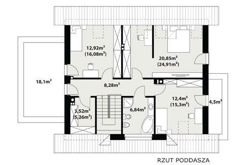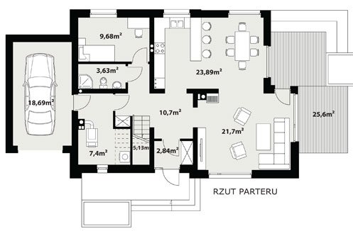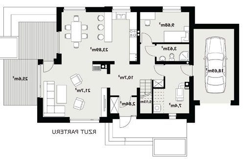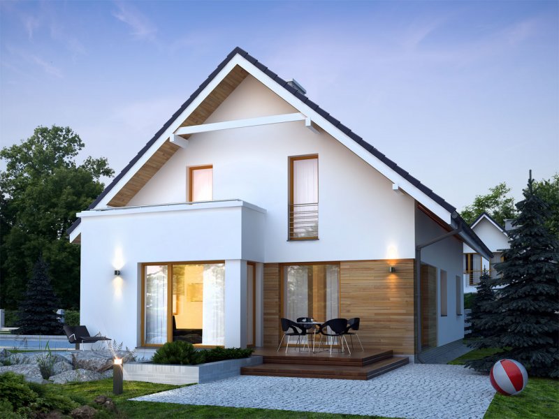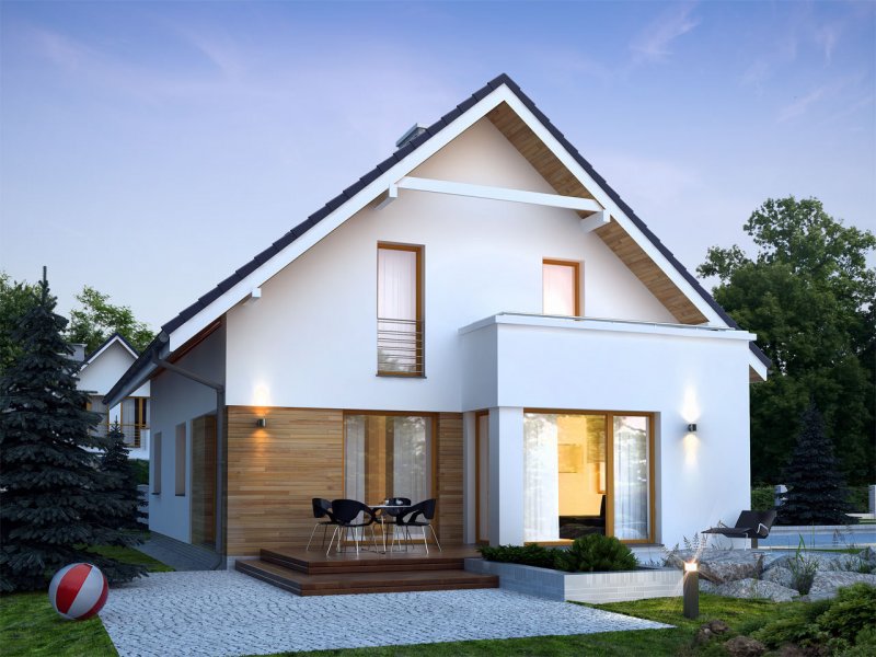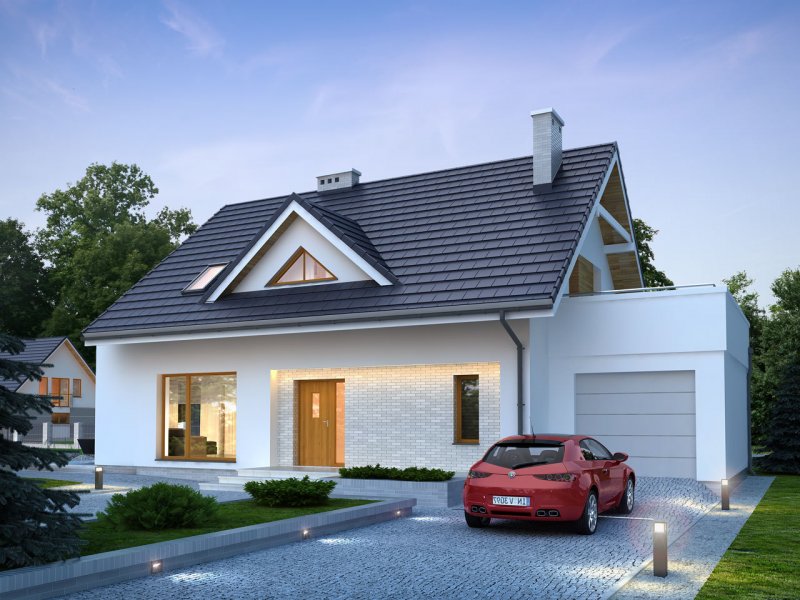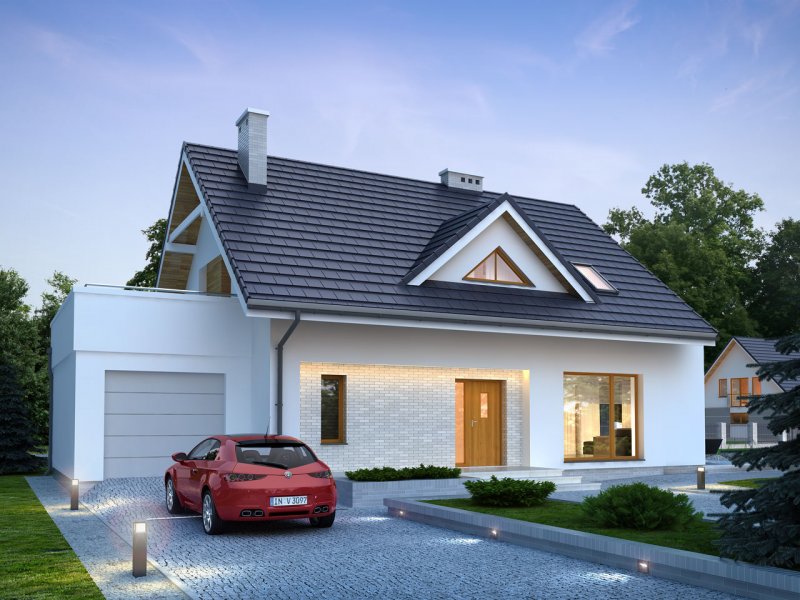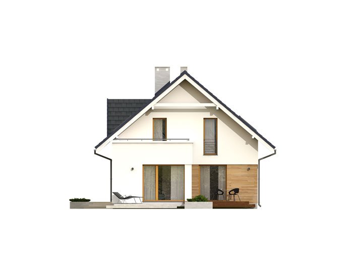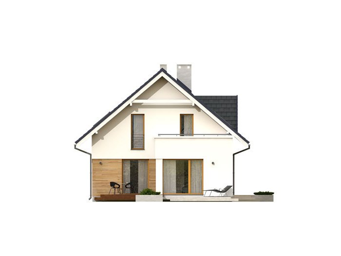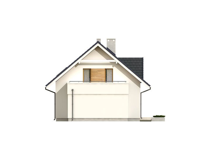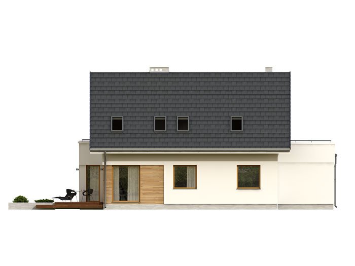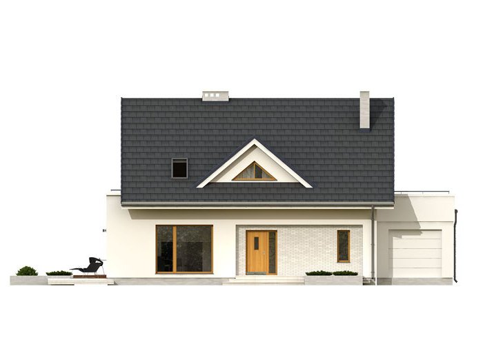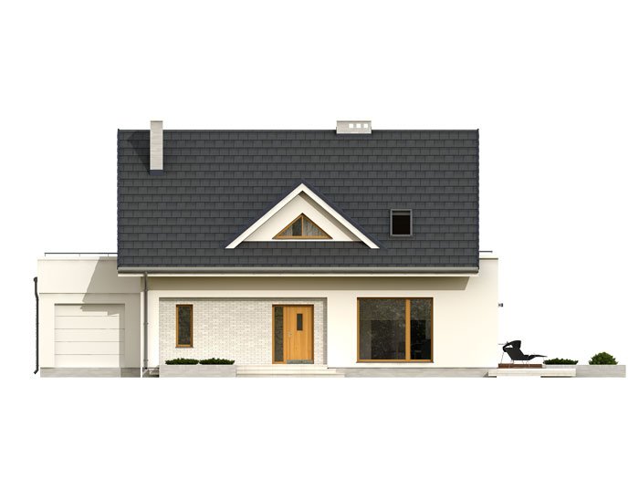 Jednorodzinny dom parterowy z użytkowym poddaszem, niepodpiwniczony z jednostanowiskowym garażem.Zaprojektowany na działkę z wejściem od południa. Optymalny program pomieszczeń oraz jego układ zapewnia komfort 4,5-osobowej rodzinie. Ten wygodny dom to prosta klasyczną bryła wzbogacona eleganckimi, nowoczesnymi elewacjami. Przestronna część dzienna na parterze, otwiera się na ogród poprzez duże przeszklenia w salonie, jadalni oraz kuchni. Oprócz części reprezentacyjnej na parterze przewidziano również dodatkowy pokój, który można zaadaptować na gabinet bądź dodatkową sypialnię. Na poddaszu, w części nocnej zaprojektowano 3 sypialnie, w tym jedną z wydzielonym kącikiem do pracy, łazienkę oraz garderobę, którą w razie potrzeby można przerobić na pralnię. Dom posiada dużą kotłownię, która umożliwia montaż kotła na każdy rodzaj paliwa.