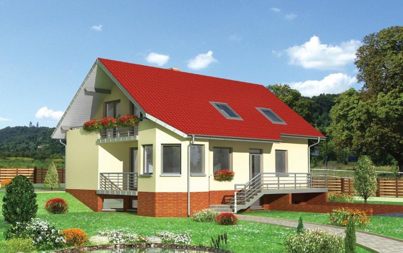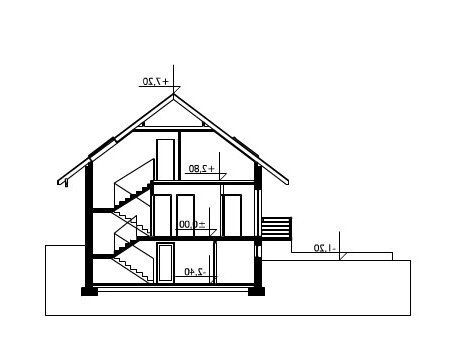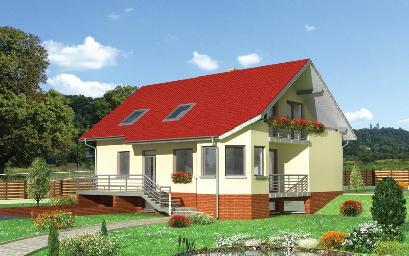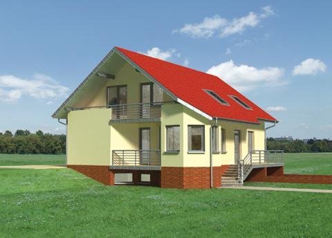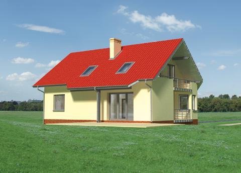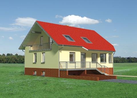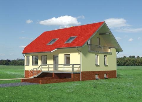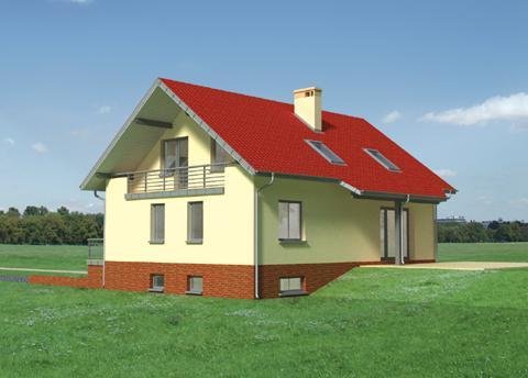 Z holu mamy po prawej stronie dostępną kuchnie z jadalnią oraz salon. Po lewej stronie znajduje się wc oraz w głębi pokój zaopatrzony w łazienkę z prysznicem. Na poddaszu usytuowano trzy sypialnie z loggią oraz łazienkę. W piwnicy znajduje się garaż z jednym stanowiskiem parkingowym, pomieszczenie gospodarcze z hobby, kotłownia ze składem opału,spiżarnia oraz pomieszczenie gospodarcze służące jako podręczny warsztat. Bryła budynku jest zwarta, przykryta dwuspadowym dachem o kącie nachylenia 37 stopni. Od strony elewacji frontowej dach obniża swój okap w celu przykrycia wysuniętej jadalni w formie ośmioboku wsuniętego w bryłę budynku. Od strony elewacji ogrodowej część dachu przykrywa fragmentu tarasu.