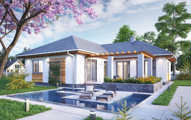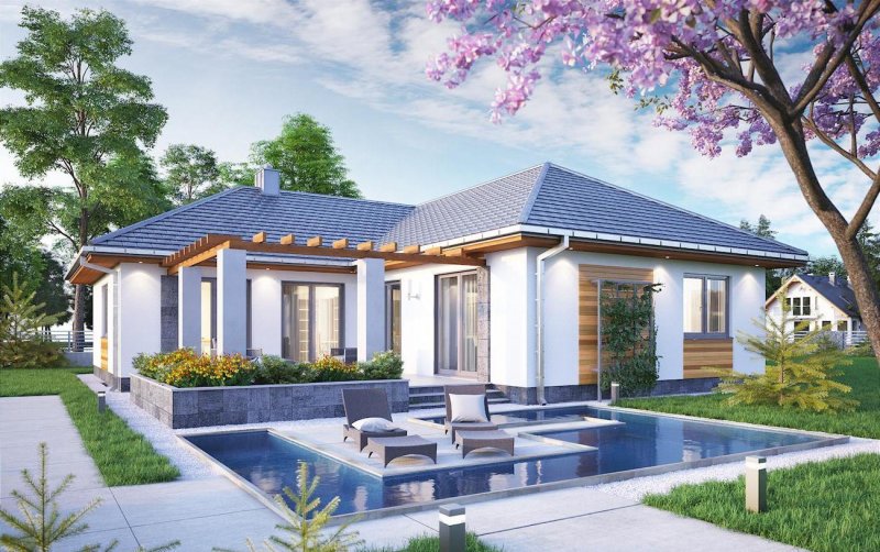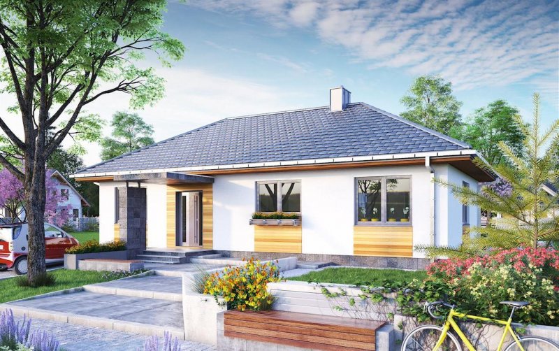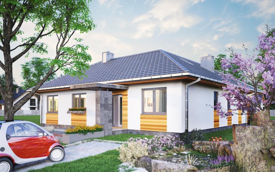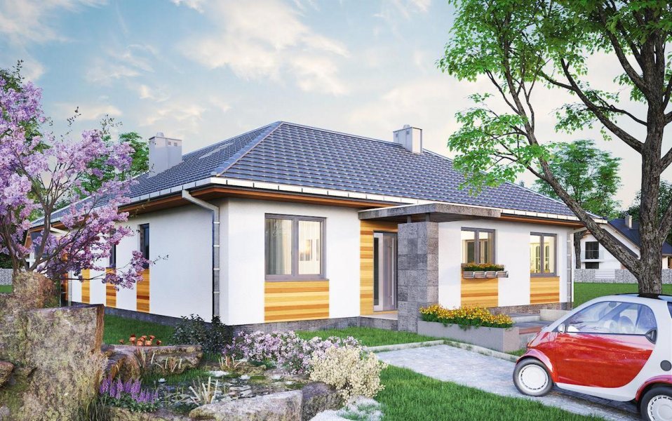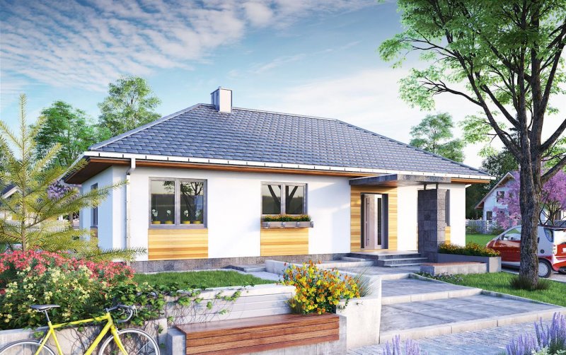 Zdyscyplinowany zarys planu i czterospadowe, przenikające się dachy o jednej wysokości kształtują prostą, elegancką bryłę. Oprócz daszku akcentującego wejście frontowe, najciekawszym elementem jest atrium. Obiega je piękna pergola, zamykająca od ogrodu całość założenia na planie zbliżonym do kwadratu. Neutralny charakter architektury pozwala wpisać Menueta w każde otoczenie.
