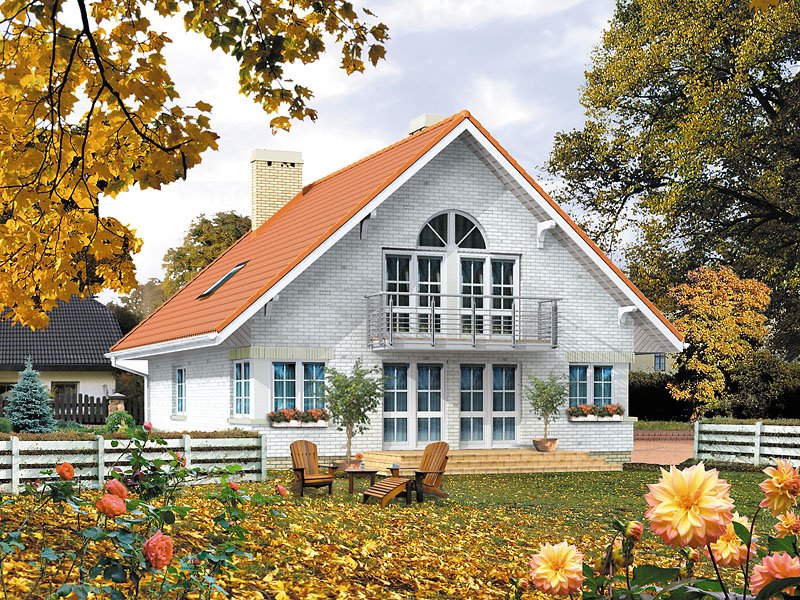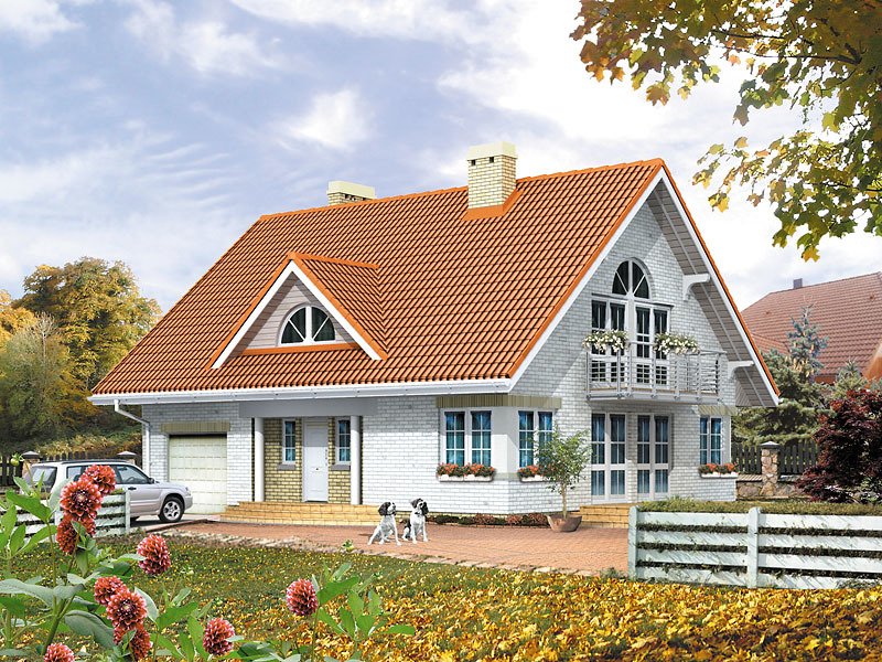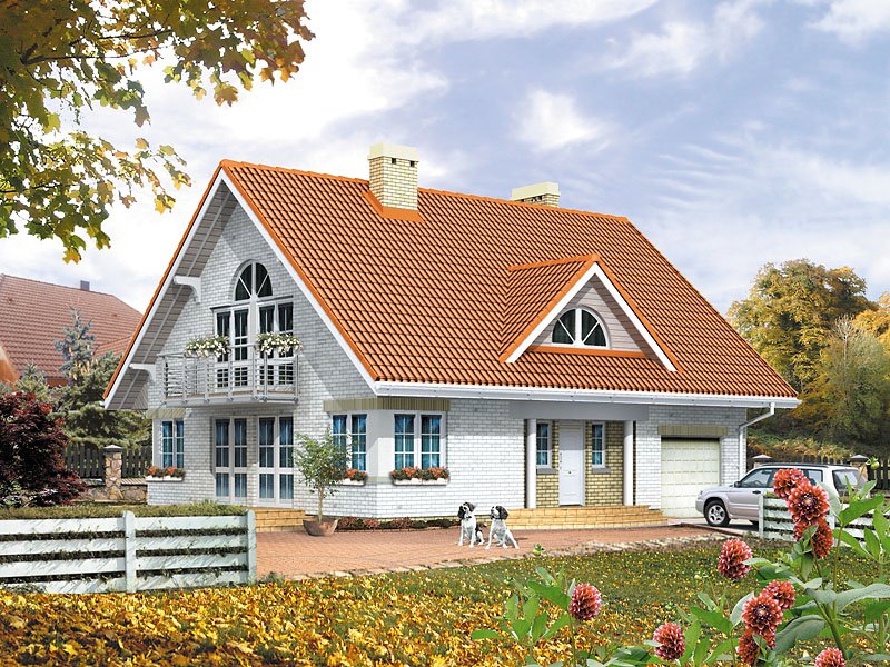 Dom jednorodzinny, wolno stojący, niepodpiwniczony z garażem i użytkowym poddaszem, przeznaczony dla 4 – 5-osobowej rodziny. Na parterze pokój dzienny z jadalnią i wyeksponowanym kominkiem, dodatkowy pokój dla starszej osoby z możliwością adaptacji na pracownię, ciekawie rozwiązana klatka schodowa. Na poddaszu trzy duże sypialnie; sypialnia rodziców wyposażona w osobną łazienkę i garderobę. Antresola ma wydzielone miejsce do odpoczynku przy książce i filiżance kawy.