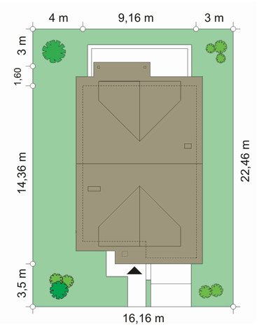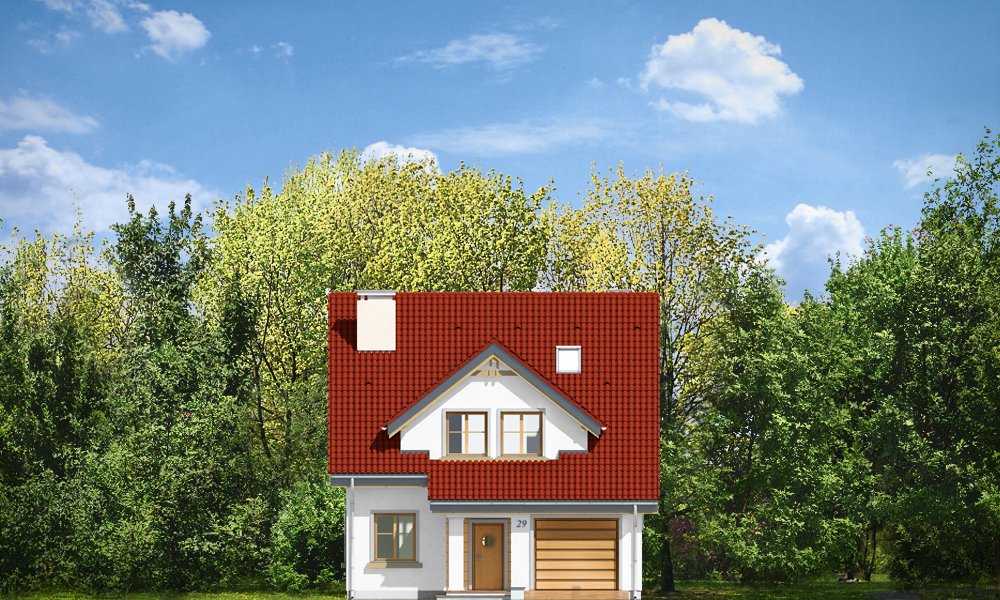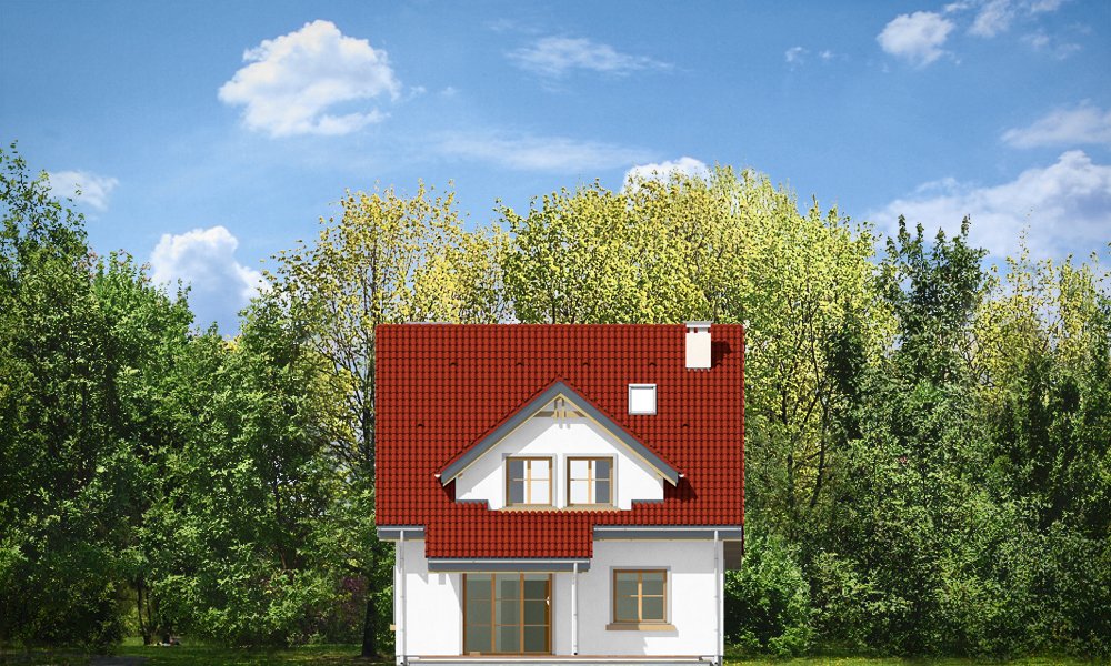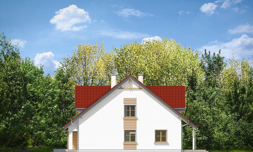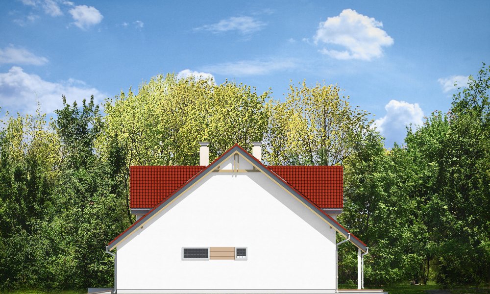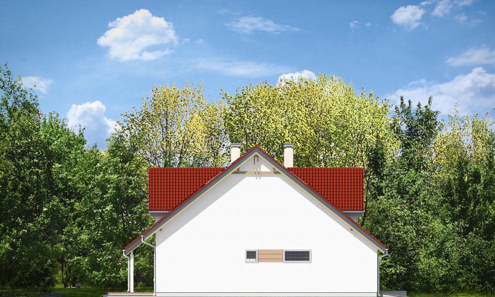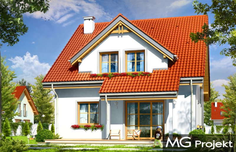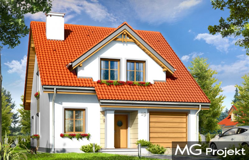 Mewa to domek jednorodzinny, dla 4-5cioosobowej rodziny. Projekt łączy w sobie tradycyjny solidny wygląd, bezpretensjonalność, prostotę konstrukcji, oraz funkcjonalność i klarowność wnętrza. Dom – dzięki zwartej bryle, zbudowanej na planie prostokąta, jest energooszczędny, a także łatwy i niedrogi w budowie. Dzięki dość wąskiej elewacji frontowej zmieści się na działce o szerokości zaledwie 16 m. Budynek w łatwy sposób można zamienić na bliźniaka, można z niego także zrobić szeregówkę. Prosty układ konstrukcyjny - parterowa bryła z poddaszem przekrytym dwuspadowym dachem – nie powinien sprawić kłopotów wykonawczych żadnej ekipie budowlanej. Właściwy stosunek powierzchni przegród zewnętrznych do uzyskanej kubatury sprzyja energooszczędności budynku. Wygląd zewnętrzny domu doskonale wpasuje się w sąsiednią zabudowę przedmieść. Elewacje urozmaicają duże lukarny w dwuspadowym dachu, wystający nieco garaż z podcieniem wejściowym, oraz – od tyłu – zadaszenie tarasu, na który możemy wyjść z salonu przez ładne przeszklone drzwi. Wnętrze domu podzielono na część dzienną, oraz gospodarczą na parterze i sypialnie na poddaszu. Na parterze zaprojektowano bardzo ładne jednoprzestrzenne wnętrze połączonego salonu z jadalnią, kuchnią i holem. Kuchnia jest otwarta na salon – można ją łatwo oddzielić ścianką działową. Pozostałe pomieszczenia parteru to wygodny garaż z magazynem pod schodami, kotłownia, łazienka i przedsionek. Na poddaszu znajdziemy cztery bardzo ładne, ustawne sypialnie, oraz łazienkę. Wnętrze można dowolnie modyfikować przestawiając ścianki działowe - zostawiając na przykład trzy sypialnie i dodając jeszcze jedną łazienkę i garderobę rodziców. Nad poddaszem jest jeszcze ładny strych, który również można zaadaptować. Dom zaprojektowany jest dla Klientów szukających prostej konstrukcji, bez udziwnień, chcących „wycisnąć” jak najwięcej powierzchni za rozsądne pieniądze. Pracownia posiada odbicie lustrzane projektu.