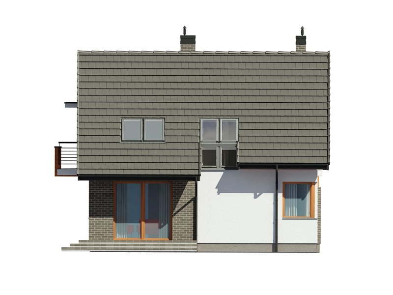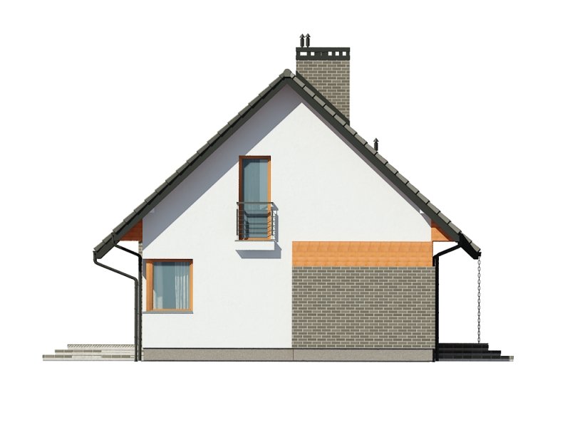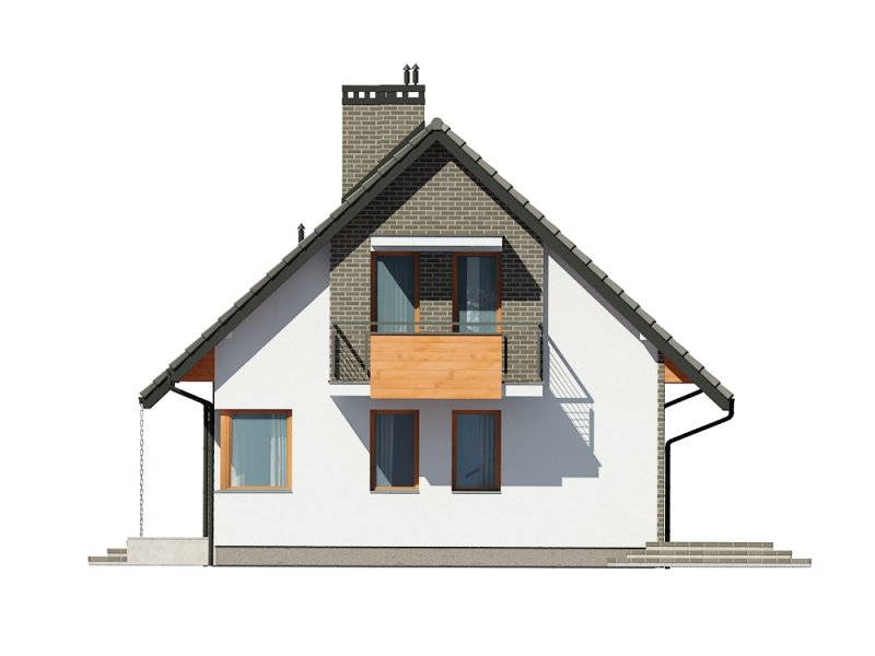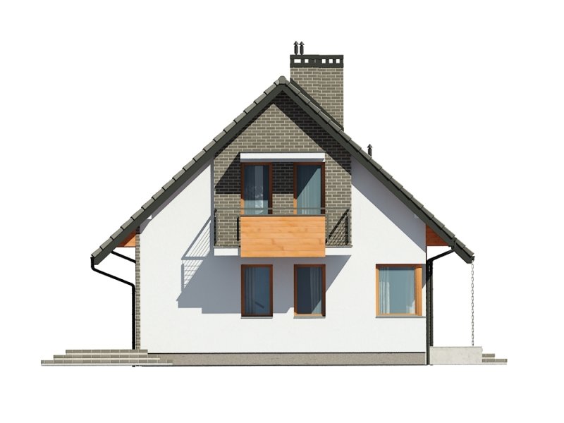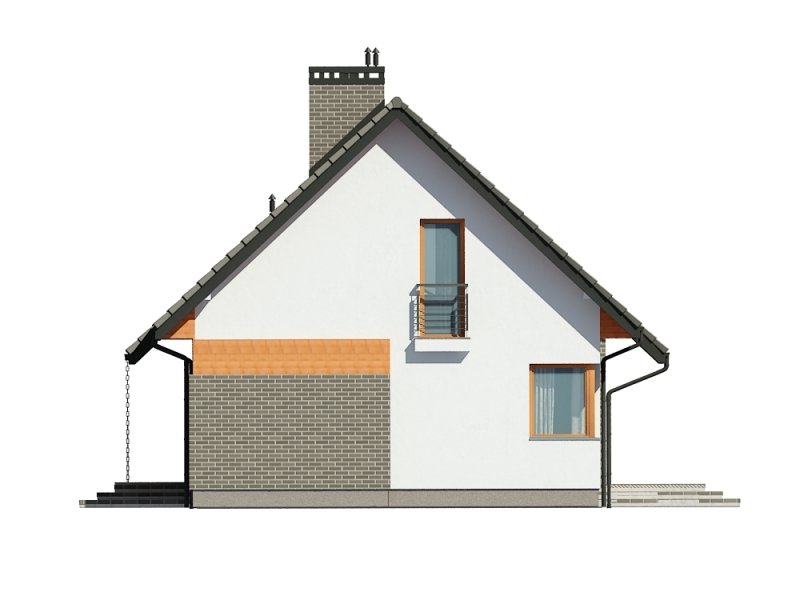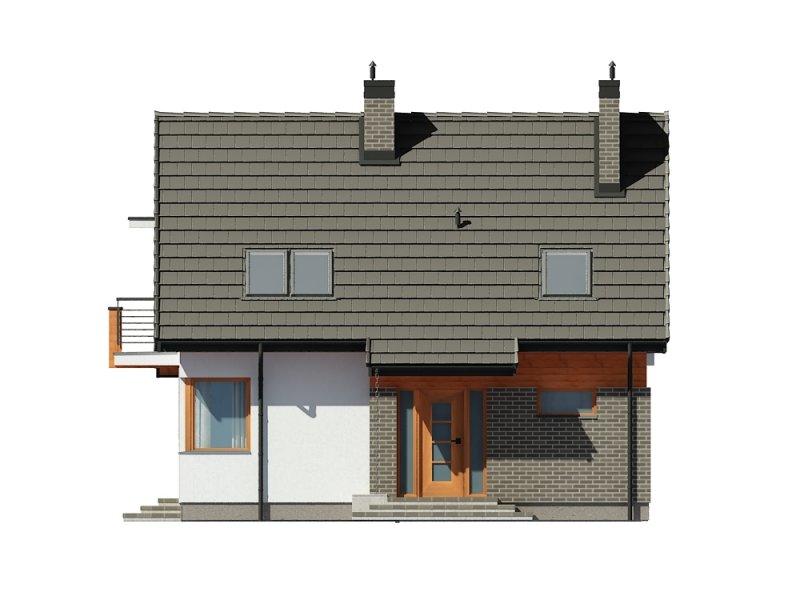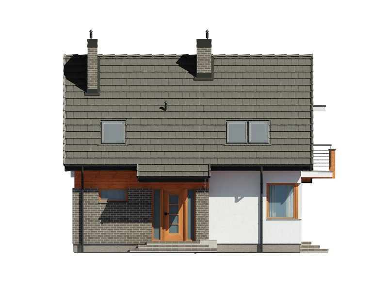 Jednorodzinny dom parterowy z poddaszem użytkowym, niepodpiwniczony. Przeznaczony dla 4-5 osób. Na parterze zaprojektowano salon z kominkiem, otwartą kuchnię z aneksem jadalnym, dodatkowy pokój przeznaczony na sypialnię lub gabinet, wc, wiatrołap, hol i kotłownię (pomieszczenie gospodarcze); na poddaszu zaprojektowano sypialnię rodziców, łazienkę i garderobę ogólnodostępną oraz dwie sypialnie; cechą charakterystyczną tego domu jest prosta, współczesna forma oraz ekonomiczne rozwiązanie funkcjonalne pomieszczeń z maksymalnie zredukowaną komunikacją.