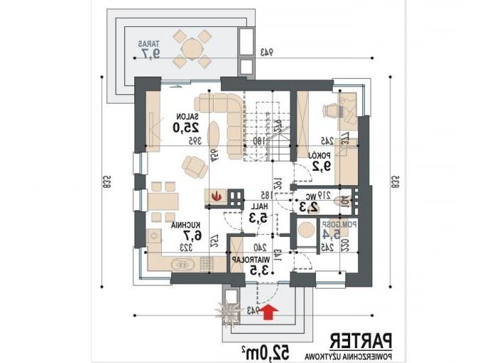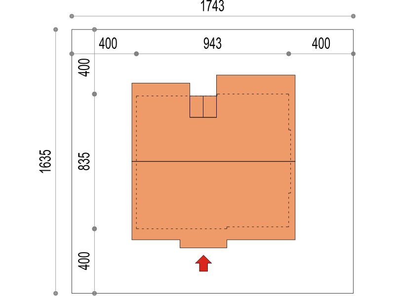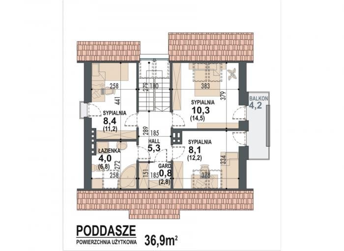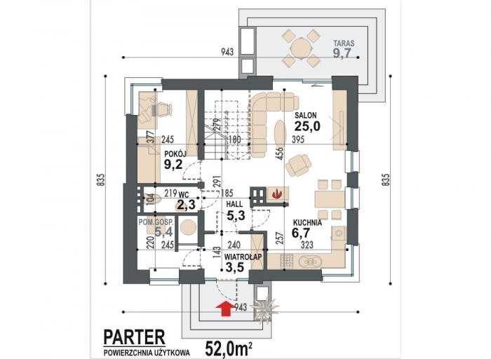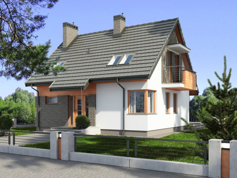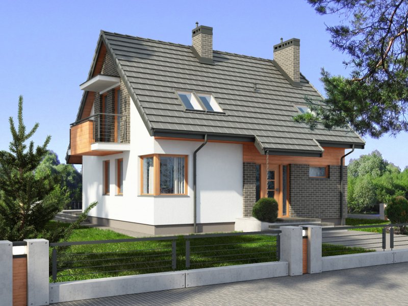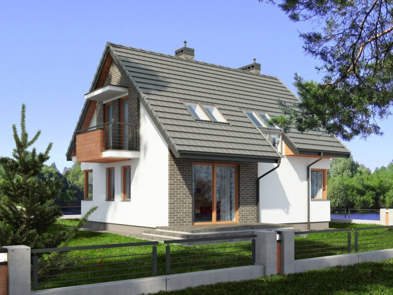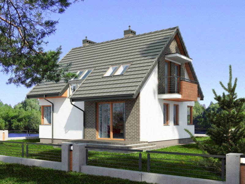 Jednorodzinny dom parterowy z poddaszem użytkowym, niepodpiwniczony. Przeznaczony dla 4-5 osób. Na parterze zaprojektowano salon z kominkiem, otwartą kuchnię z aneksem jadalnym, dodatkowy pokój przeznaczony na sypialnię lub gabinet, wc, wiatrołap, hol i kotłownię (pomieszczenie gospodarcze); na poddaszu zaprojektowano sypialnię rodziców, łazienkę i garderobę ogólnodostępną oraz dwie sypialnie; cechą charakterystyczną tego domu jest prosta, współczesna forma oraz ekonomiczne rozwiązanie funkcjonalne pomieszczeń z maksymalnie zredukowaną komunikacją.