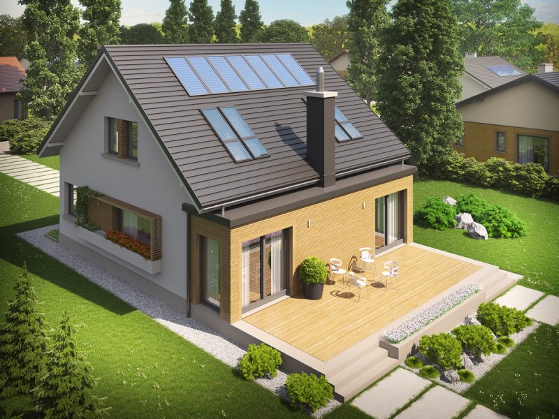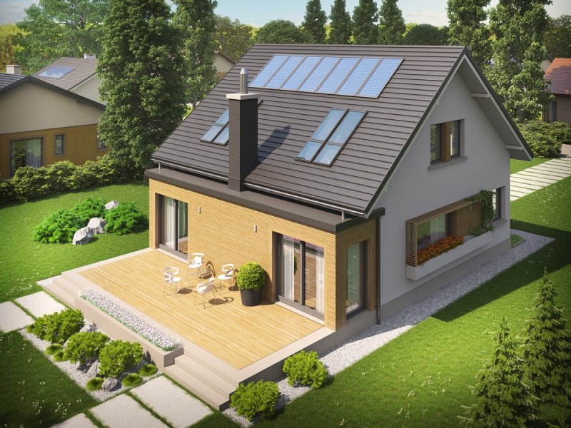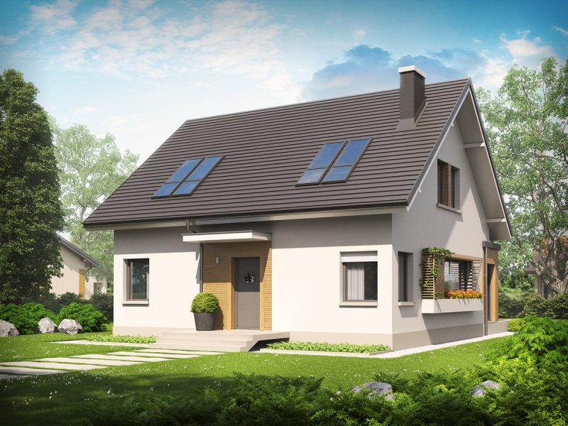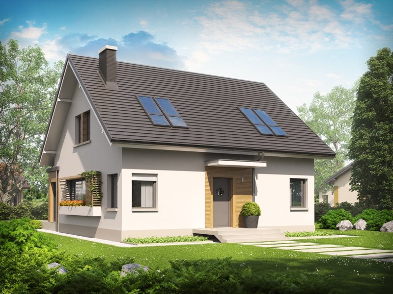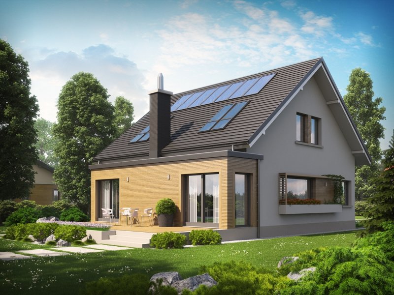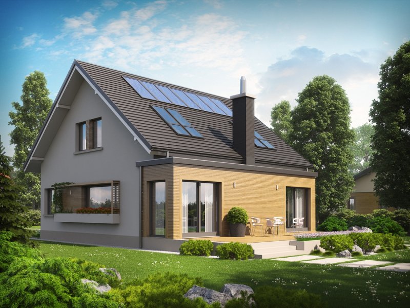- Elewacje: tynk cienkowarstwowy mineralny i okładzina drewniana