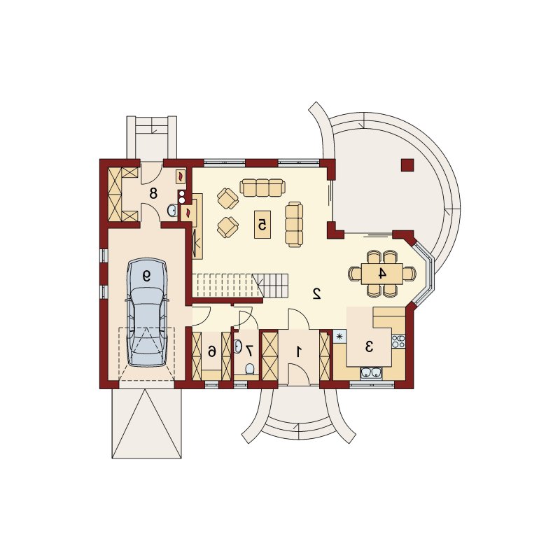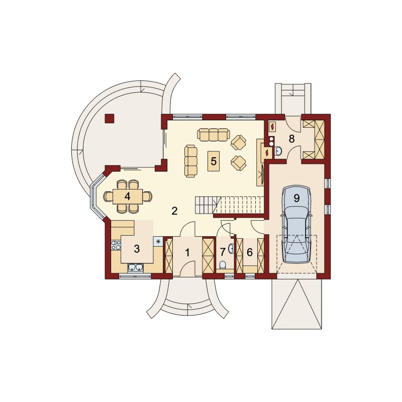 Wyjście na taras z salonu i jadalni oraz bliska lokalizacja kuchni pozwala na wygodne użytkowanie tarasu w trakcie letnich przyjęć.