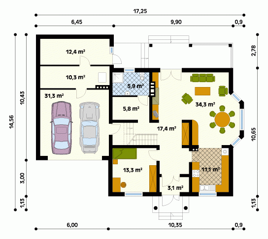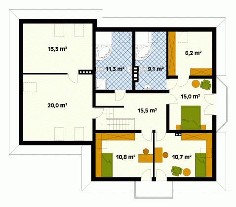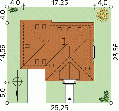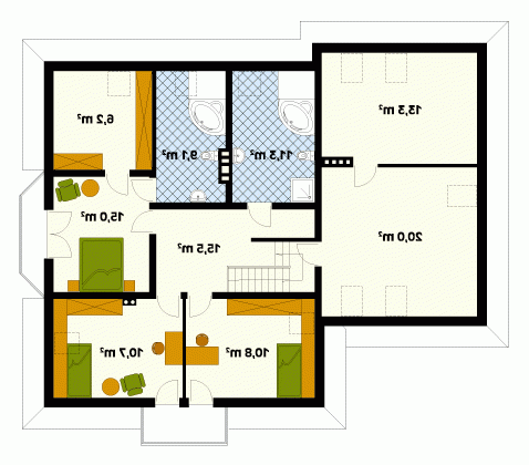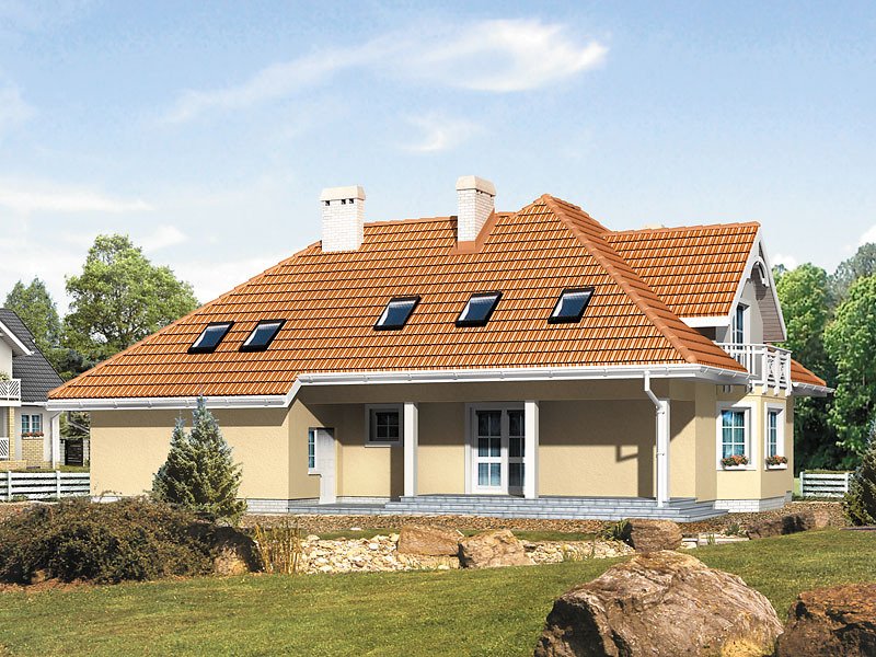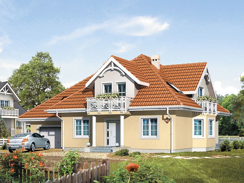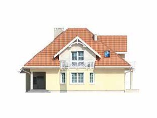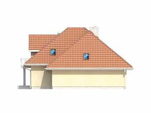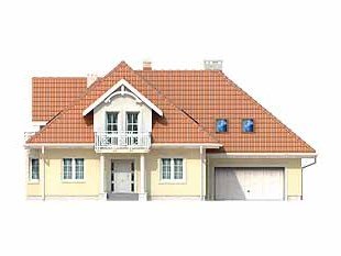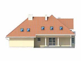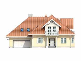 Dom parterowy z poddaszem użytkowym i garażem dwustanowiskowym, niepodpiwniczony dla 4 – 5-osobowej rodziny. Na parterze zaprojektowano dodatkowy pokój – gabinet. Na poddaszu mamy trzy sypialnie, garderobę, dwie łazienki i pomieszczenie rekreacyjne.