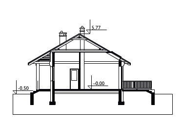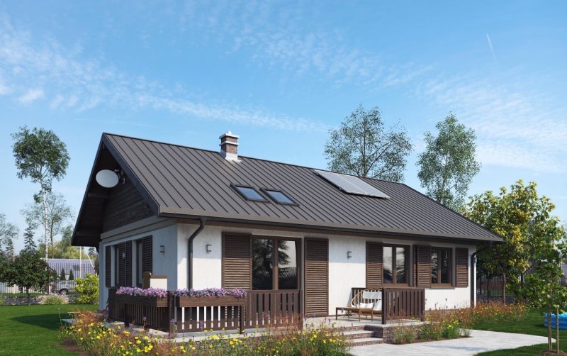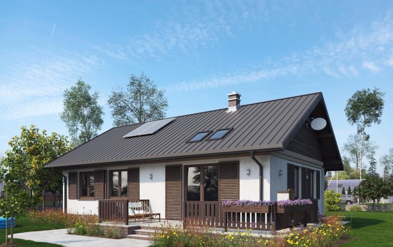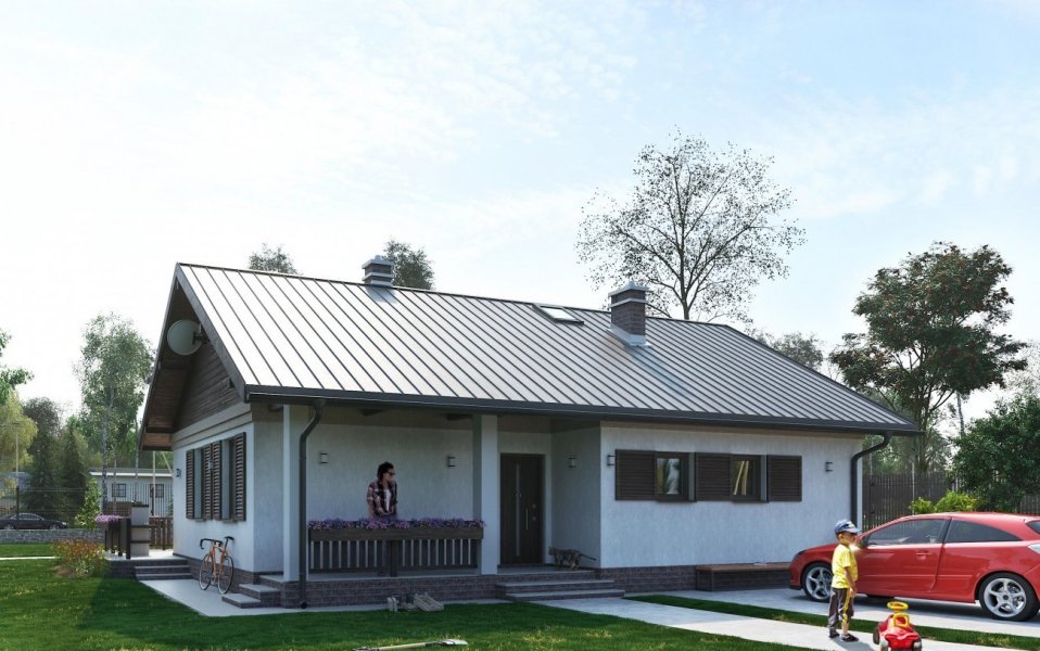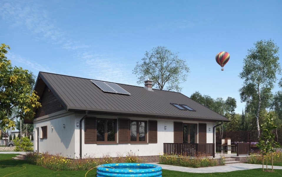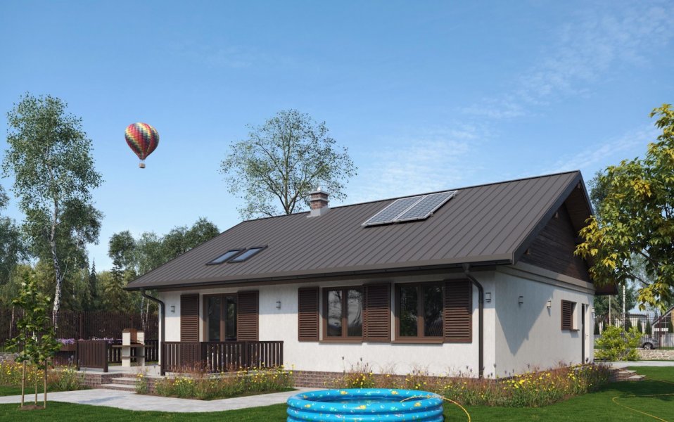 Budynek jest parterowy z nieużytkowym poddaszem, niepodpiwniczony. Na parterze znajduje się sień, kotłownia, pom. gospodarcze, łazienka, hol, kuchnia, pokój dzienny z jadalnią oraz dwie sypialnie. Modrzyk Eko to propozycja parterowego domku dla trzyosobowej rodziny. Ściany zewnętrzne o bardzo dużej izolacyjności (U=0,14W/m2K) z bloków wapienno-piaskowych Silka i 20cm warstwy wełny mineralnej zamykają prosty rzut. Straty ciepła minimalizuje dodatkowo zastosowanie energooszczędnych szyb i profili oraz przemyślane rozmieszczenie otworów okiennych. Elewację wejściową urozmaica jedynie praktyczny podcień i niezbędne doświetlenie łazienki oraz kotłowni. Za sprawą okien dachowych w południowej połaci dachu wnętrze salonu zyskuje niezwykły urok, a budynek może kumulować więcej darmowej słonecznej energii. W projekcie architektury zaproponowano miejsce montażu kolektorów słonecznych Viessmann. Po wykonaniu projektu ich instalacji (dostosowanego do warunków nasłonecznienia w konkretnej lokalizacji) będą one mogły współpracować z instalacją centralnej wody użytkowej. Straty ciepła z powietrza wentylacyjnego kontroluje i minimalizuje wentylacja mechaniczna, która latem zapewnia także utrzymanie przyjemnego chłodu w pomieszczeniach.