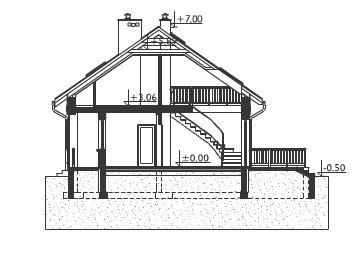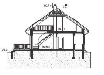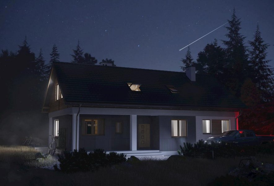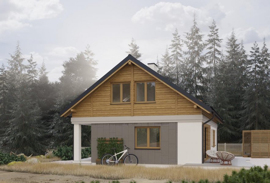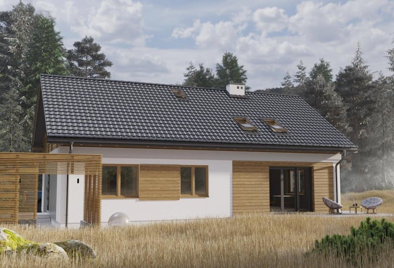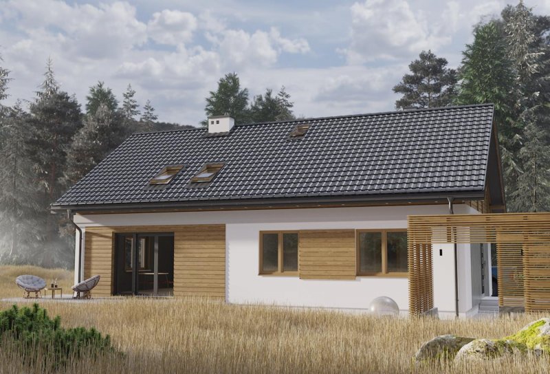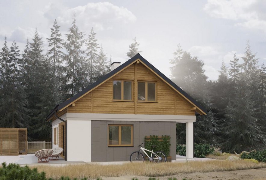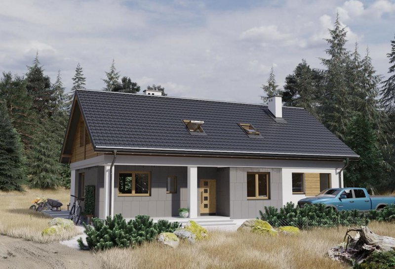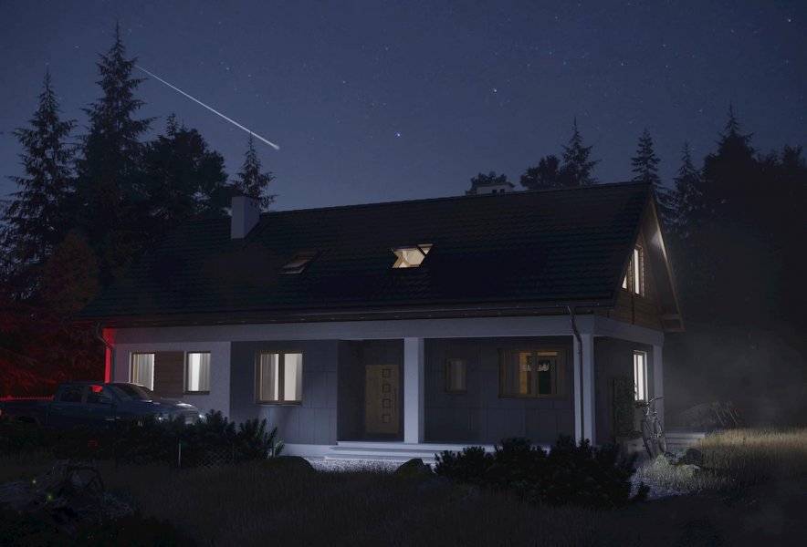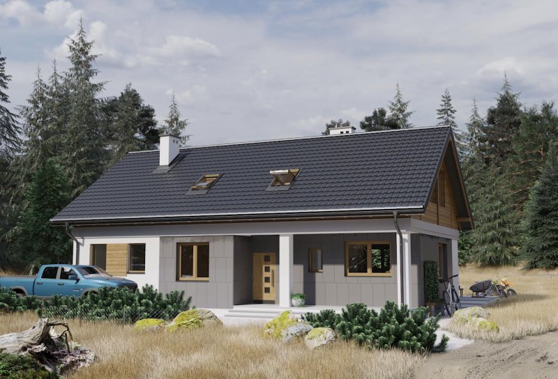 Rodzina Modrzyka grupuje niewielkie parterowe domy bez garażu o przyjaznej naturalnemu krajobrazowi, niskiej, tradycyjnej bryle. Wśród innych propozycji z dwuspadowym dachem i prostokątnym rzutem wszystkie warianty Modrzyka wyróżnia wejściowa, podłużna weranda w narożniku oraz dużo miejsca dla funkcji gospodarczych. Projekt domu Modrzyk Max jest największy i oferuje wygodne mieszkanie dla 6-7 osób. Wyjątkowo w rodzinie, dzięki oszczędnym schodom z salonu, wykorzystuje poddasze, choć kąt nachylenia połaci wzrósł tylko o 5º. Na parterze rozlokowano otwarty na hol pokój dzienny z kuchnią, trzy sypialnie, łazienkę i kotłownię z osobnym wejściem z zewnątrz. Okna dachowe nadają wnętrzu salonu niezwykły urok, a przestronna antresola poddasza z dwoma dalszymi sypialniami i łazienką jest bardzo jasna. Prosta architektura daje dużą swobodę w najlepszym zharmonizowaniu bryły z konkretnym otoczeniem. Projekt domu Modrzyk Max ma gładkie elewacje bez balkonów i przy zachowaniu gabarytów oraz charakteru pokrewnych, parterowych wersji jest jednocześnie najprostszym rozwiązaniem wśród projektów domów z użytkowym poddaszem średniej wielkości bez garażu.