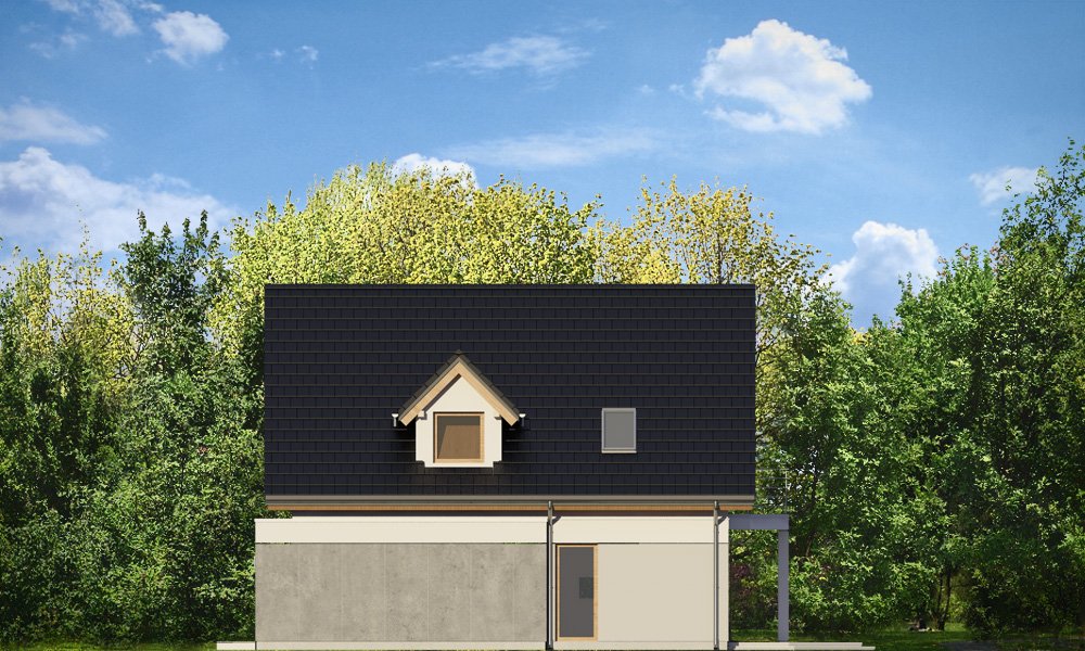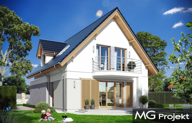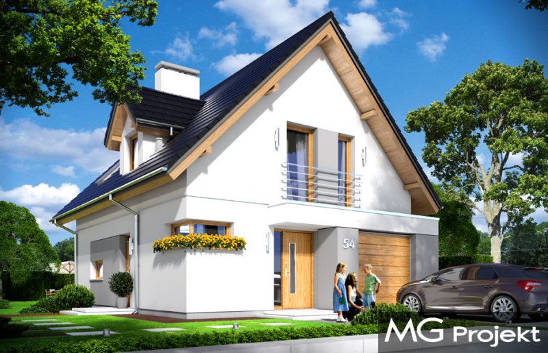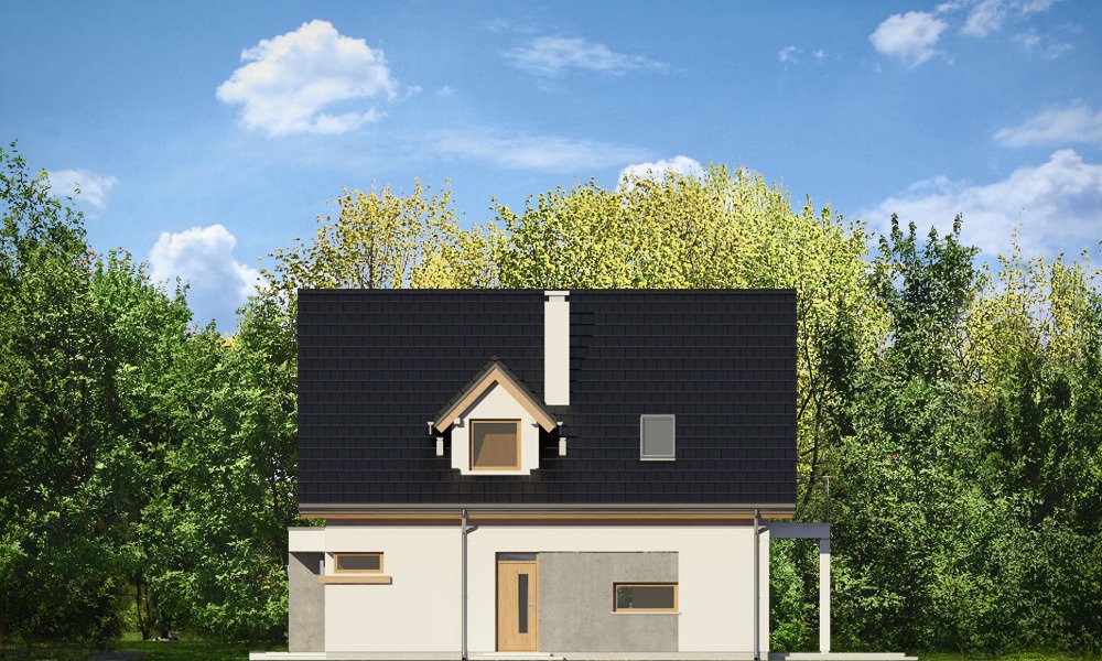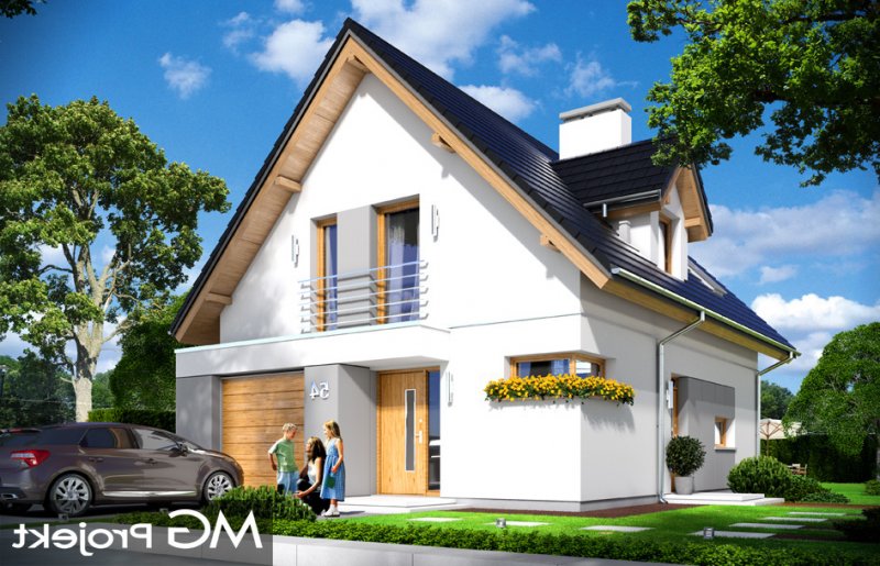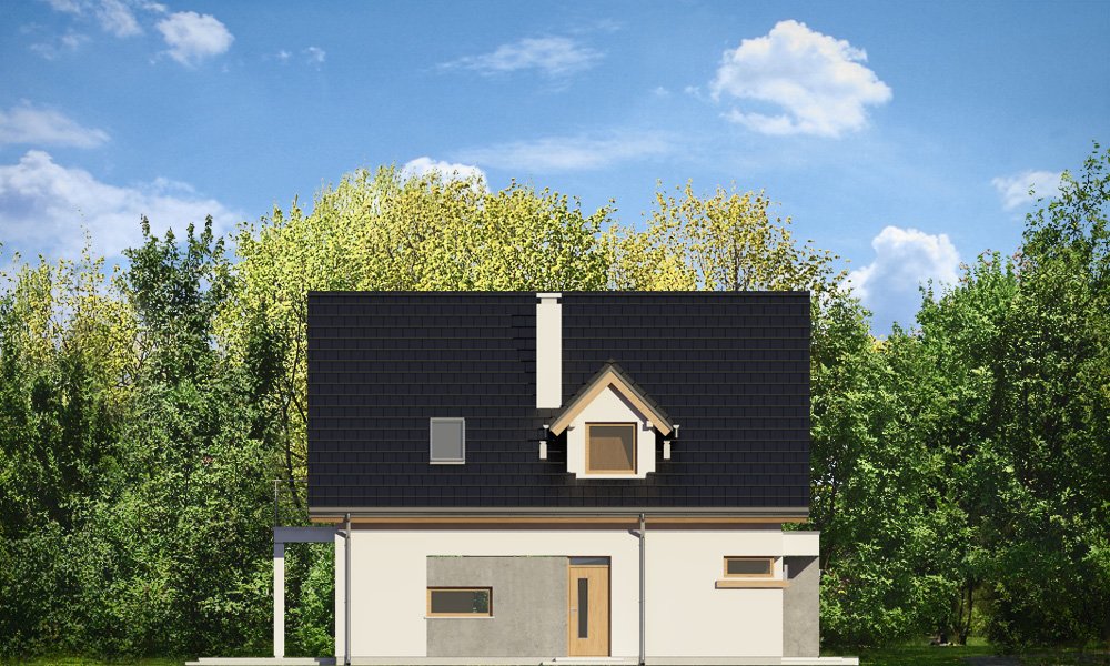 Na swoim to sympatyczny dom jednorodzinny dla 4-5cioosobowej rodziny. Z naszym projektem zbudujecie Państwo piękny dom i poczujecie się wreszcie „na swoim” ;). Zapraszamy ! Domek ma zwartą prostą bryłę. Zbudowany jest na planie prostokąta. Poddasze przykrywa dwuspadowy symetryczny dach. Architektura domu jest stonowana - nowoczesna, ale jednocześnie bezpretensjonalna. Zastosowane nowoczesne materiały, kolorystyka, układ okien, okładziny naścienne - podkreślają współczesny styl domu. Jednocześnie dwuspadowy dach osadza bryłę w tradycyjnej estetyce. Dom doskonale wkomponuje się w każde otoczenie. Dom nadaje się na bardzo wąską działkę, o szerokości nieco ponad 16 metrów. Rzadko można spotkać projekt o właściwych proporcjach, z garażem, który zmieści się na tak wąskiej parceli. Wnętrze domu to : na parterze - część dzienna z pokojem dziennym i otwartą kuchnią, garaż, kotłownia z osobnym wejściem, łazienka i bardzo praktyczne schody umieszczone blisko wejścia ( dzięki temu dzieci nie skaczą rodzicom po głowie w salonie, gdy wchodzą i wychodzą z i do domu ). Na poddaszu natomiast, to trzy sypialnie z łazienką. Dzięki zwartej bryle i bardzo dobrym izolacjom przegród, dom jest energooszczędny. Bardzo łatwo go dostosować do standardu NF40. Prosta bryła, łatwa konstrukcja pozwolą też na szybką, łatwą i niedrogą budowę budynku. Powierzchni domu umożliwia zakwalifikowanie projektu „Na swoim” do programu MDM.