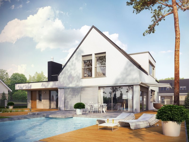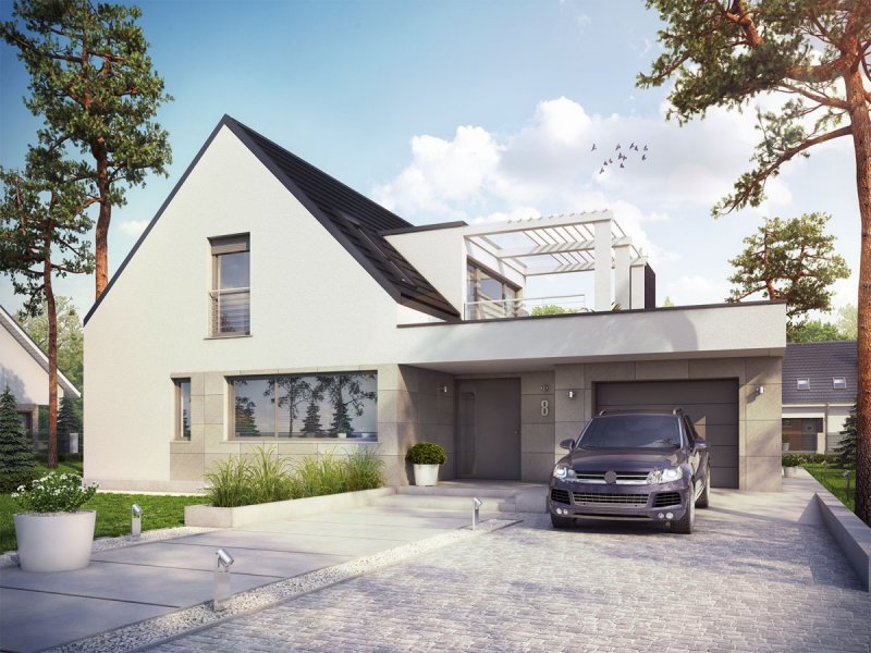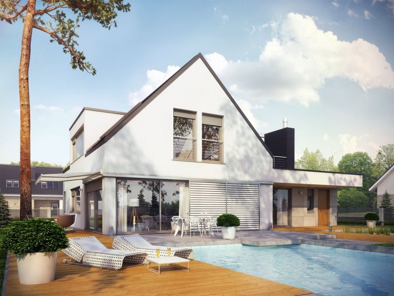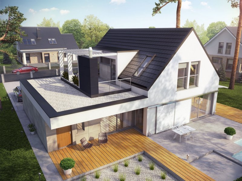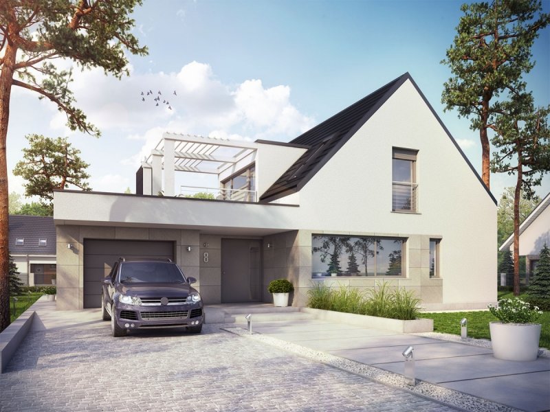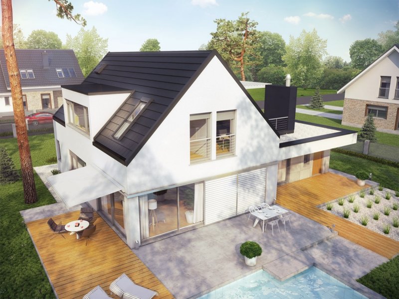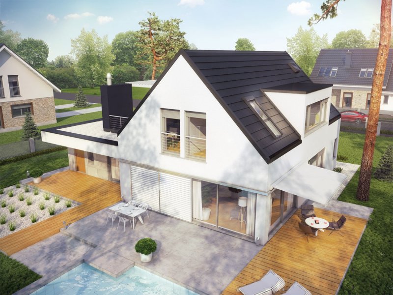 Neo G1 ENERGO PLUS to dom, zaprojektowany z myślą o inwestorach, którzy podążają z duchem czasu i szukają wygodnej, słonecznej przestrzeni do życia. W projekcie połączoną nowoczesną estetykę i sprawdzone rozwiązania funkcjonalne. Zastosowano również energooszczędne systemy, które zapewniają niskie koszty ogrzewania oraz optymalny mikroklimat wnętrza. Dużym atutem domu są dwa komfortowe tarasy – jeden o krok od salonu, a drugi z pięknym widokiem na okolicę, dostępny z sypialni i wspólnego korytarza na poddaszu.
