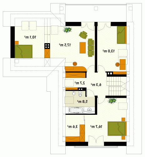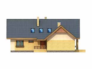 Dom parterowy z poddaszem użytkowym, niepodpiwniczony, dla 4 – 5-osobowej rodziny. Na parterze zaprojektowano pokój dzienny z kominkiem, kuchnię i jadalnię, dwa pokoje i sporą łazienkę. Na poddaszu mamy trzy duże pokoje i łazienkę.